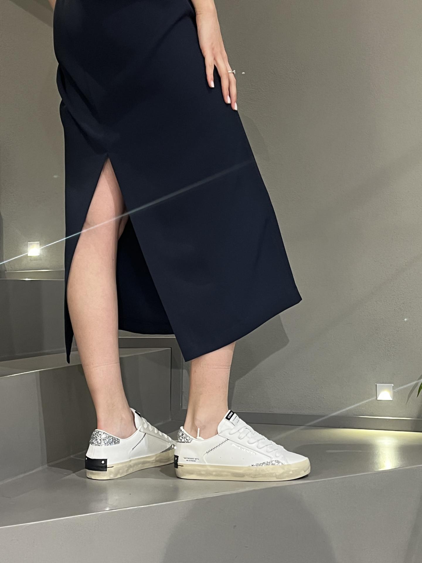 SNEAKER STRINGATA IN PELLE CON DETTAGLI GLITTERATI. PLANTARE INTERNO ESTRAIBILE. TACCO 30, FONDO GOMMA.
