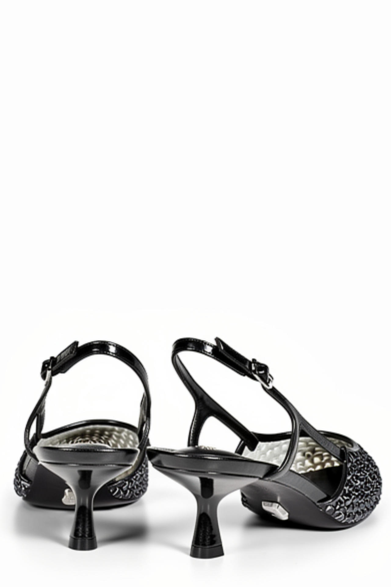 CHANEL IN SIMIL PELLE E TESSUTO CON APPLICAZIONE DI STRASS. CINTURINO REGOLABILE. TACCO 55, FONDO GOMMA.