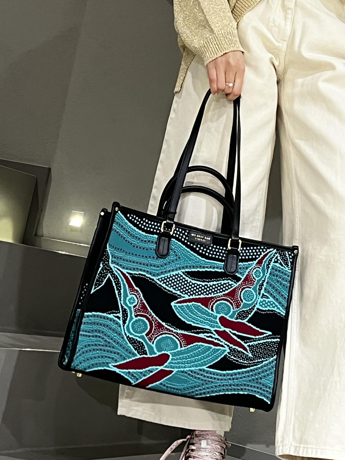 BORSA IN TESSUTO DISEGNATO CON RIFINITURE IN PELLE. MANICO CORTO E MANICO LUNGO IN PELLE, TRACOLLA IN TINTA INCLUSA E STACCABILE MEDIANTE MOSCHETTONI AI LATI. MAXI POCHETTE (ESTRAIBILE CON GANCETTI) IN TESSUTO INTERNA CON ZIP DI CHIUSURA. MISURE 38X30X15