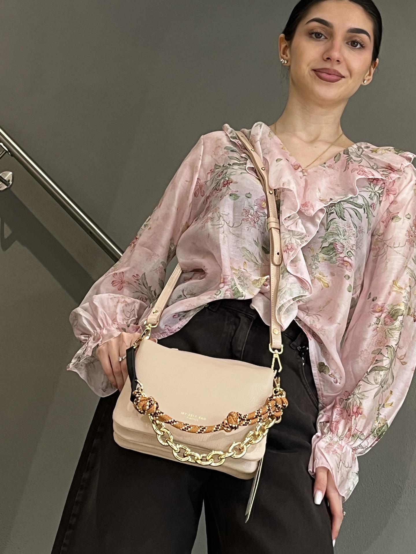 BORSA IN PELLE CON ZIP DI CHIUSURA. INTERNO FODERATO E SUDDIVISO IN TRE TASCHE. TRACOLLA CORTA DESIGN CON PELLE, TESSUTO CORDA COLORATA E CATENA (SFILABILE MEDIANTE ANELLI). TRACOLLA LUNGA IN PELLE IN TINTA INCLUSA. MISURE 22X15X8