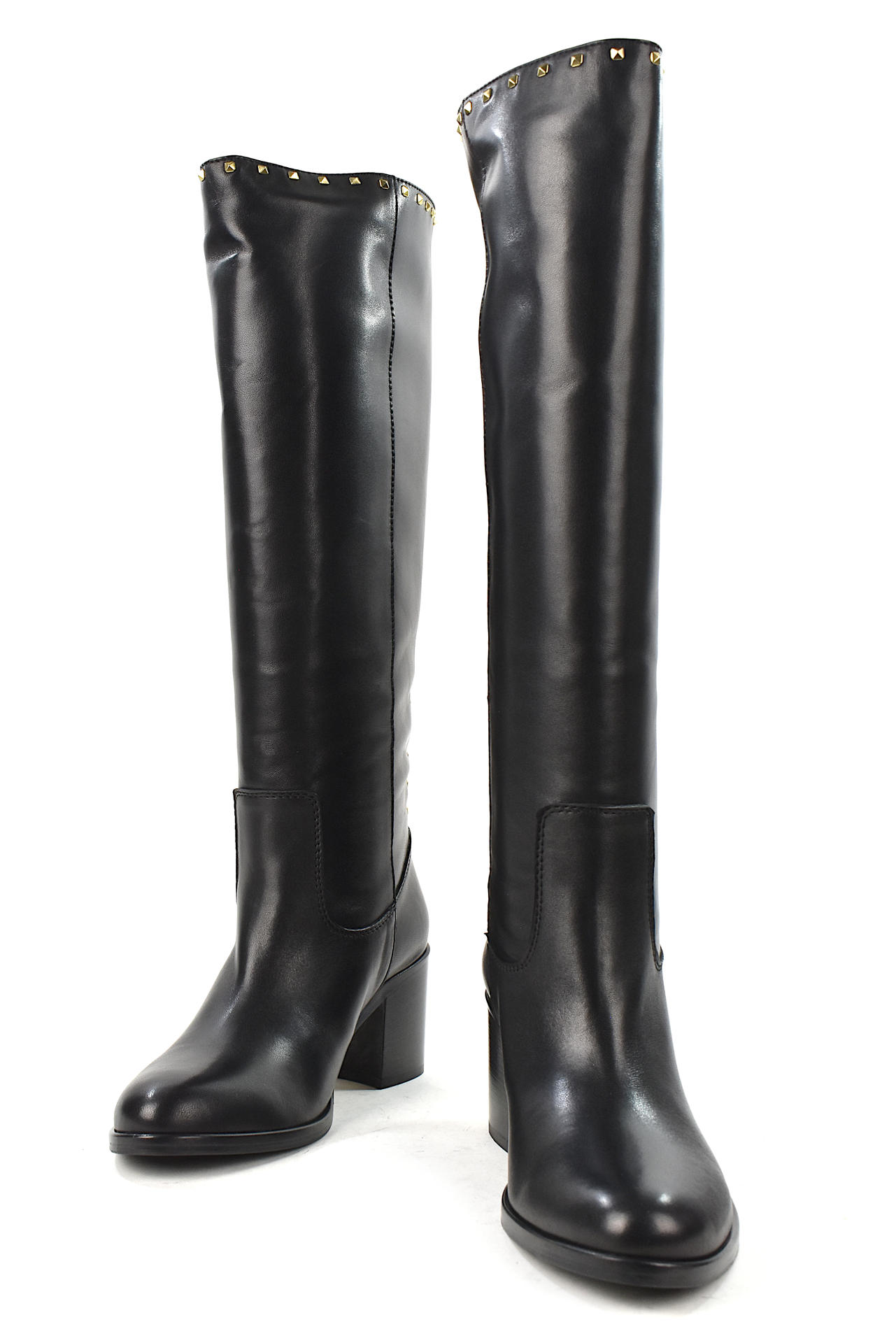 STIVALE TUBOLARE IN PELLE CON APPLICAZIONE DI MICRO BORCHIETTE DESIGN. MISURA DEL GAMBALE (DAL TALLONE COMPRESO IN SU) 400. TACCO 70, FONDO CUOIO E GOMMA. MADE IN ITALY