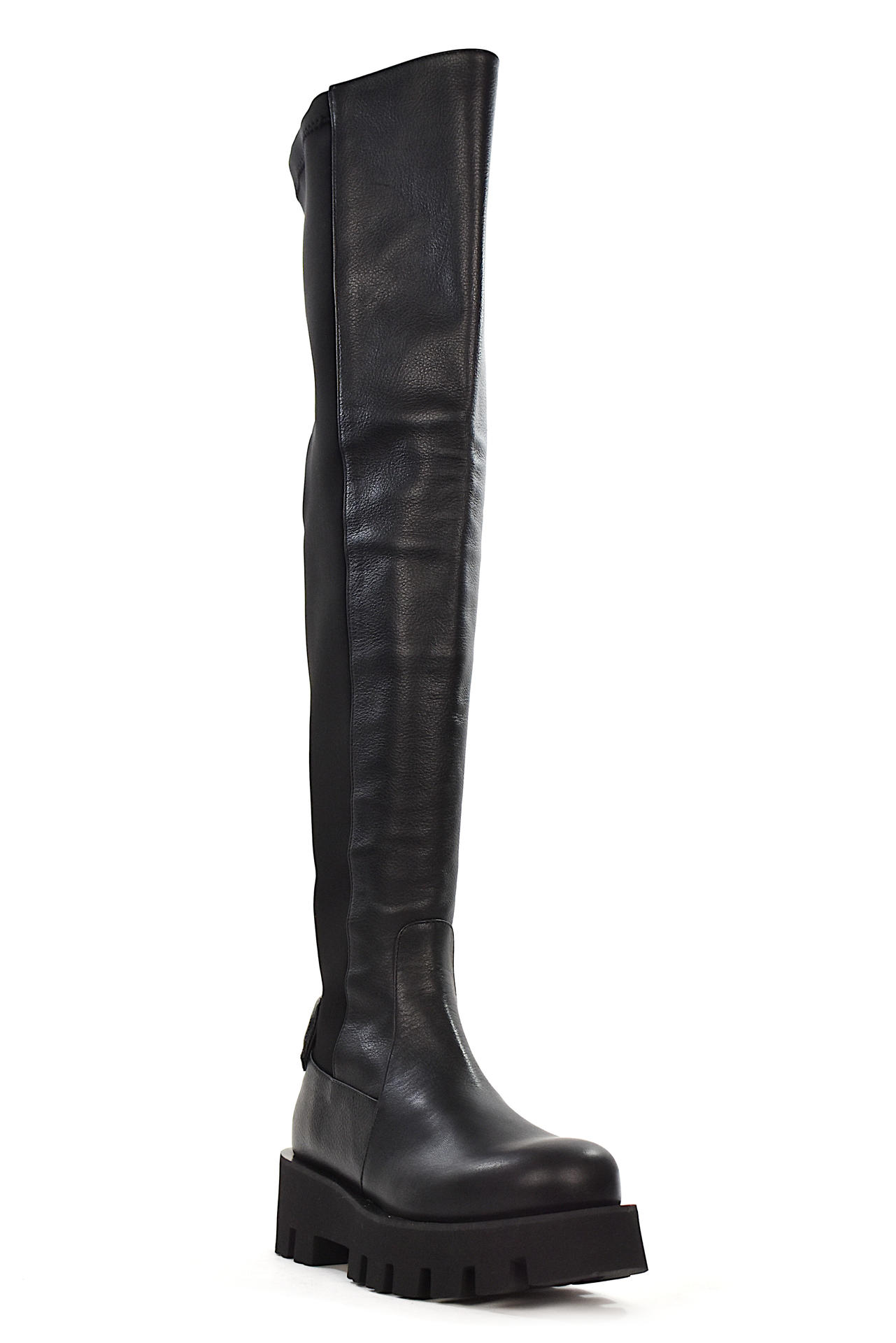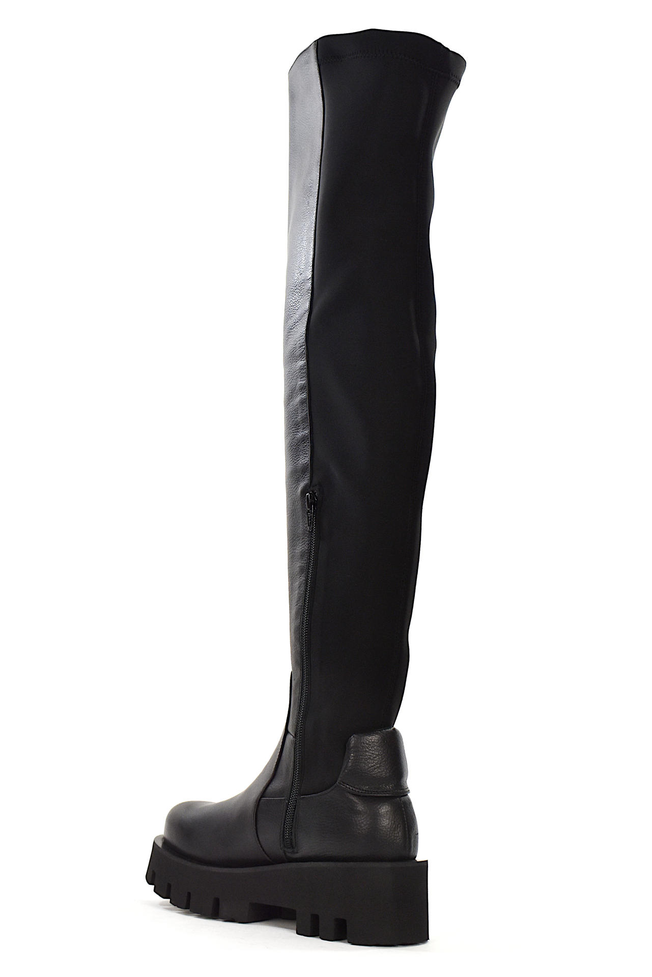 STIVALE IN PELLE E TESSUTO TECNICO ELASTICIZZATO SUL RETRO. MISURA GAMBALE (DAL TALONE COMPRESO IN SU) 590. TACCO DESIGN 50, PLATFORM 30, FONDO GOMMA. MADE IN SPAIN