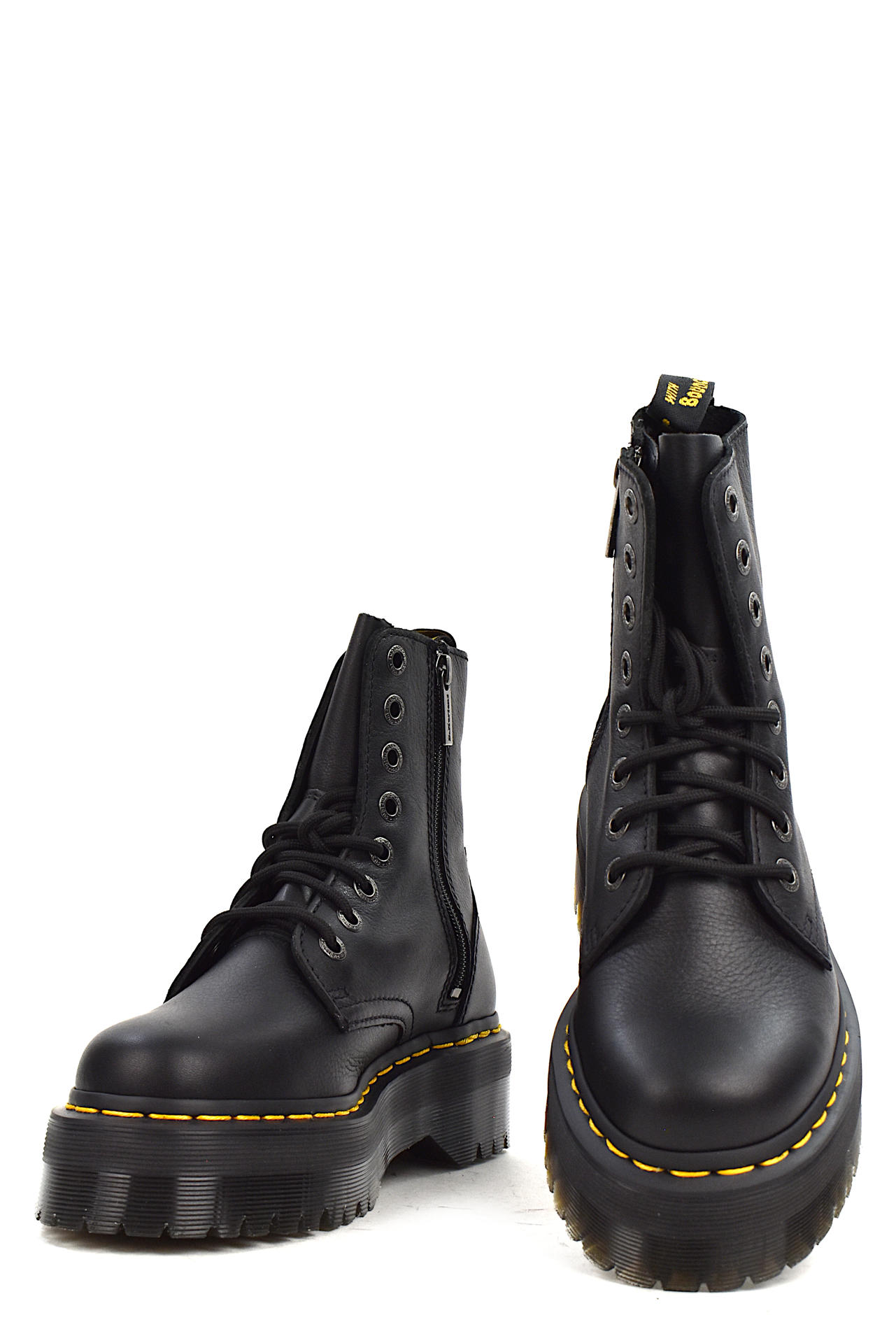 STIVALETTO 8 FORI STRINGATO E CON ZIP SU LATO INTERNO IN MORBIDA PELLE "PISA". DETTAGLI TIPICI DEL NOTO MARCHIO COME LA FETTUCCIA IN TESSUTO LOGATO SUL RETRO E LE IMPUNTURE GIALLE NELLA SUOLA. TACCO 50, PLATFORM 35, FONDO GOMMA.