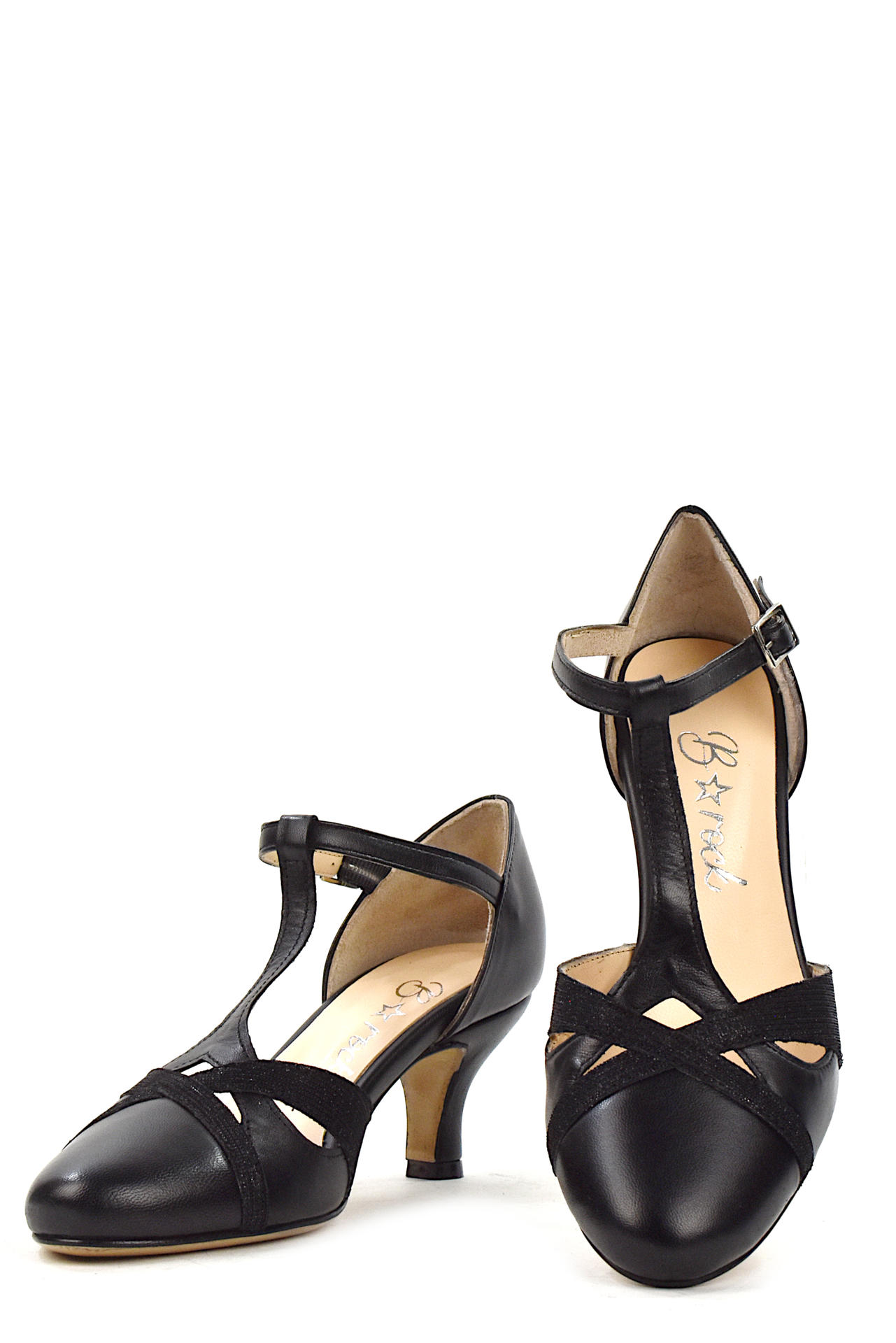 SCARPA IN PELLE CON CINTURINO E RIFINITURE IN TESSUTO GLITTERATO. TACCO 60, FONDO CUOIO. MADE IN ITALY