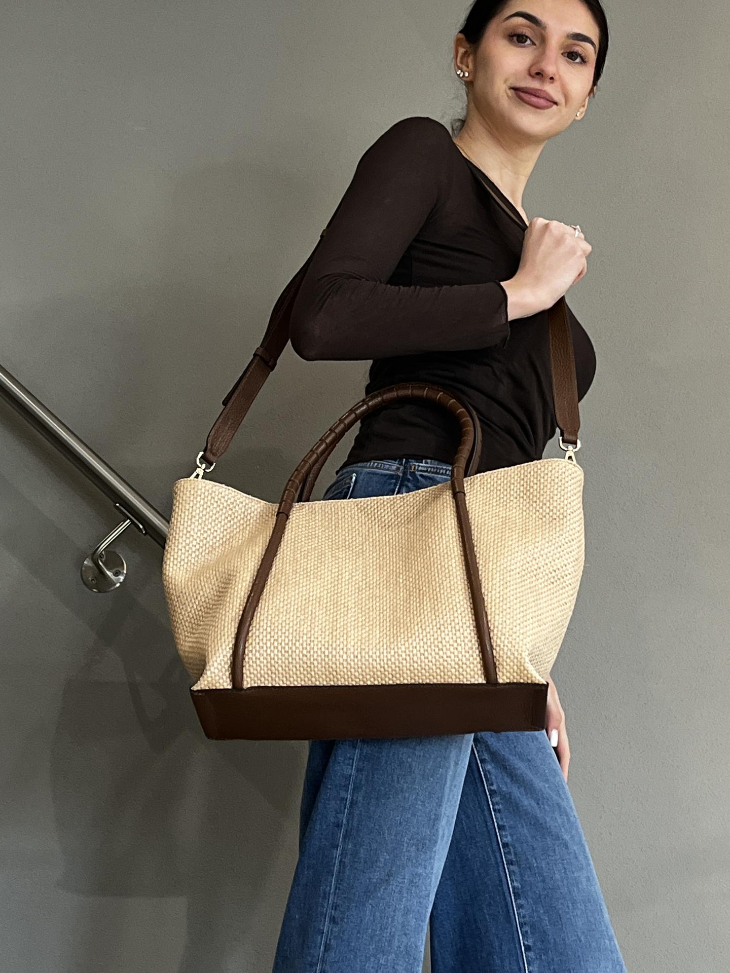 BORSA IN PELLE E RAFFIA CON ZIP DI CHIUSURA. INTERNO FODERATO E CON TASCHE. TRACOLLA IN PELLE IN TINTA INCLUSA, CON MOSCHETTONI AGLI ESTREMI. MISURE 33X26X15. MADE IN ITALY