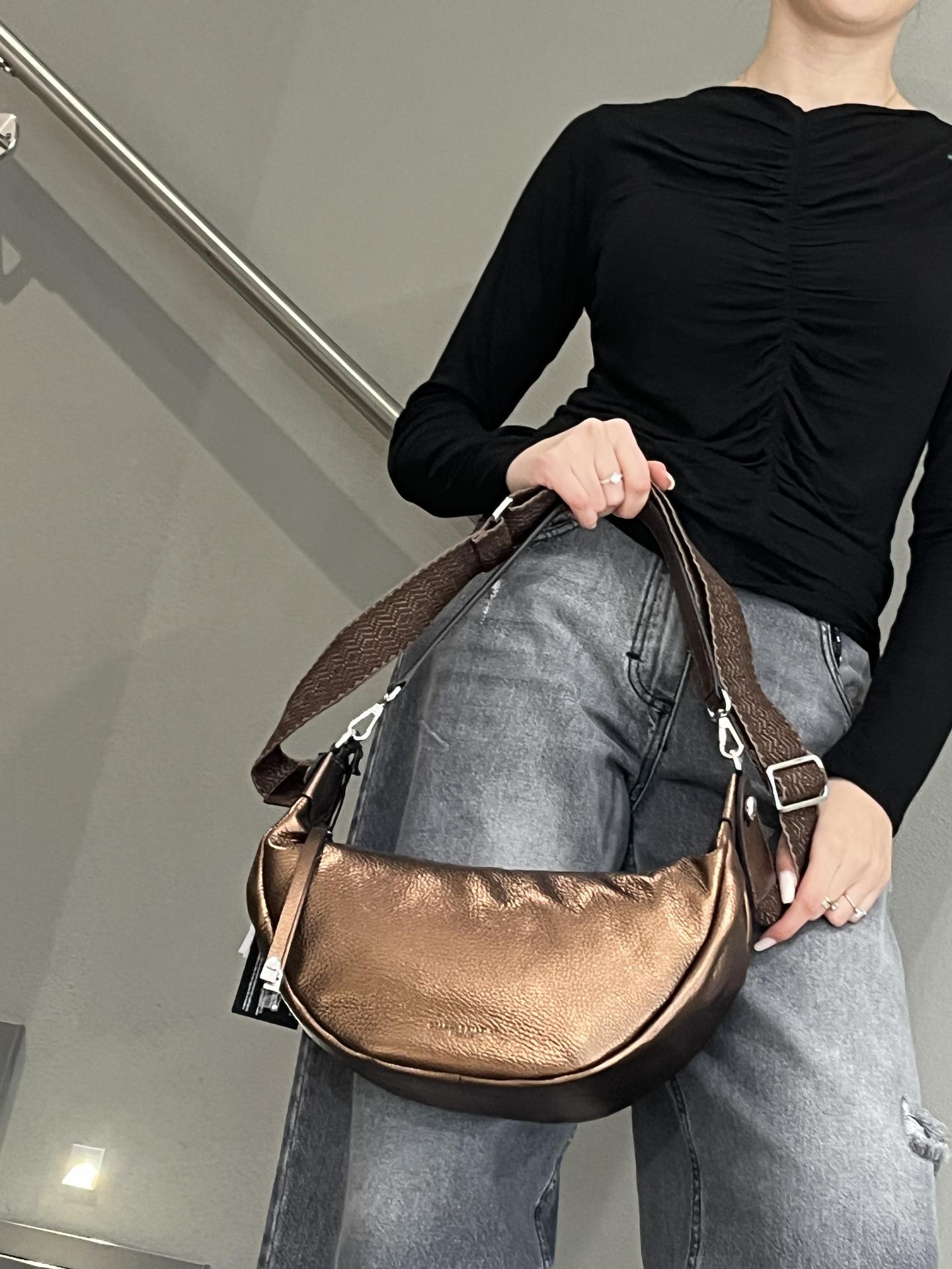 BORSA AISHA IN PELLE LAMINATA CON ZIP DI CHIUSURA. INTERNO FODERATO E CON TASCHE. TRACOLLA CORTA CON MOSCHETTONI. TRACOLLA IN TESSUTO DESIGN REGOLABILE. MISURE 30X19X13. MADE IN ITALY