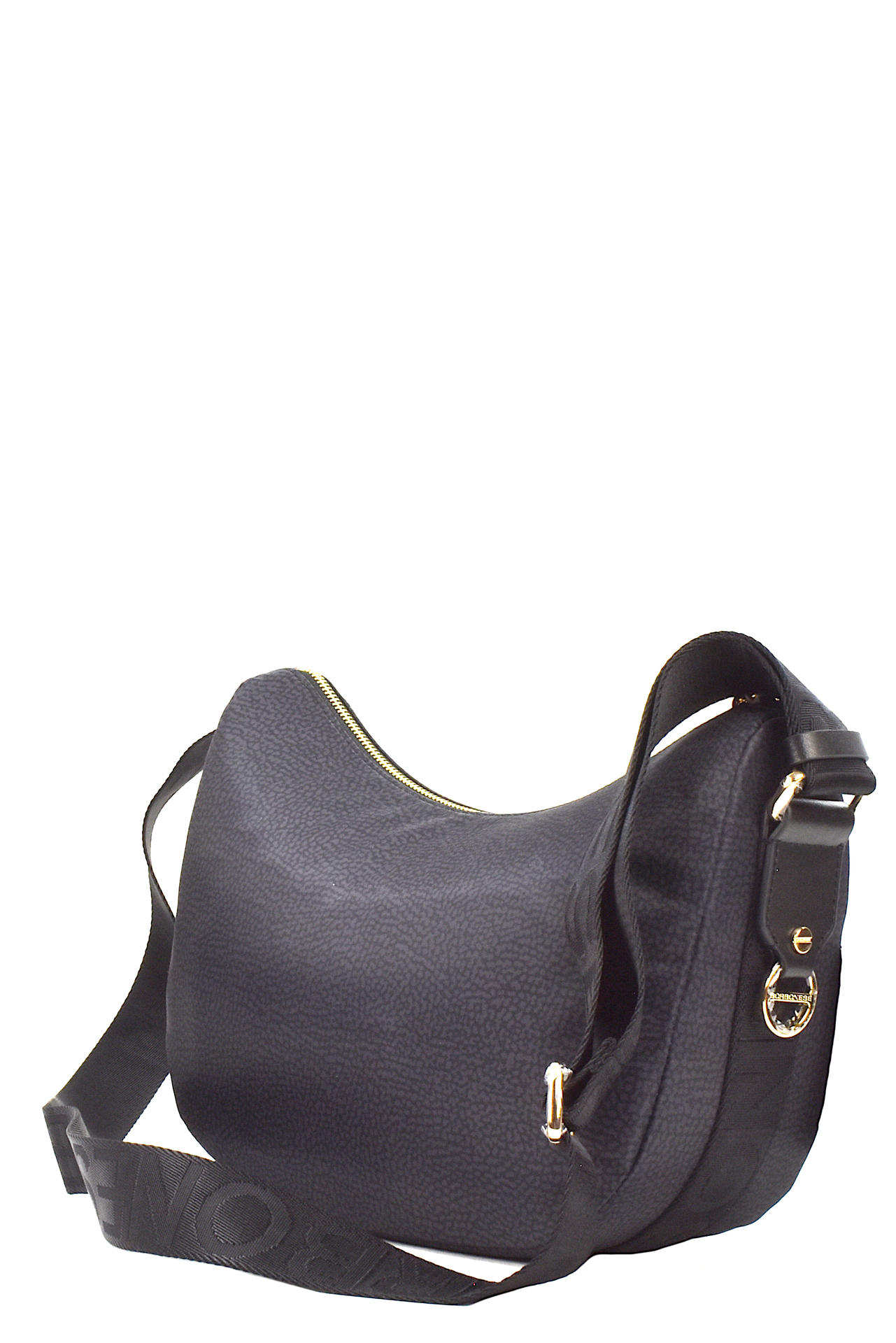 BORSA MEZZA LUNA IN TESSUTO TECNICO LOGATO EFFETTO TAPIRO CON AMPIA ZIP DI CHIUSURA. INTERNO FODERATO E CON TASCHE. TASCA FRONTALE CON ZIP. TRACOLLA IN TESSUTO REGOLABILE. MISURE 30X22X12