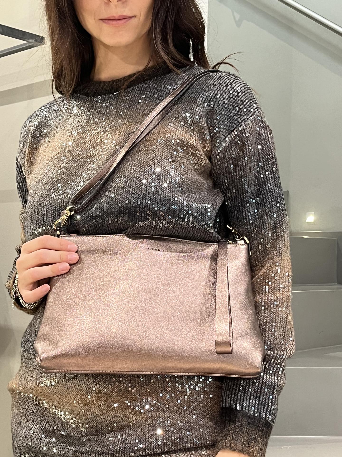 BORSA IN PELLE LAMINATA CON ZIP DI CHIUSURA. INTERNO FODERATO E CON TASCHE. MANICOTTO IN PELLE E TRACOLLA IN PELLE IN TINTA REGOLABILE. MISURE 29X19X4