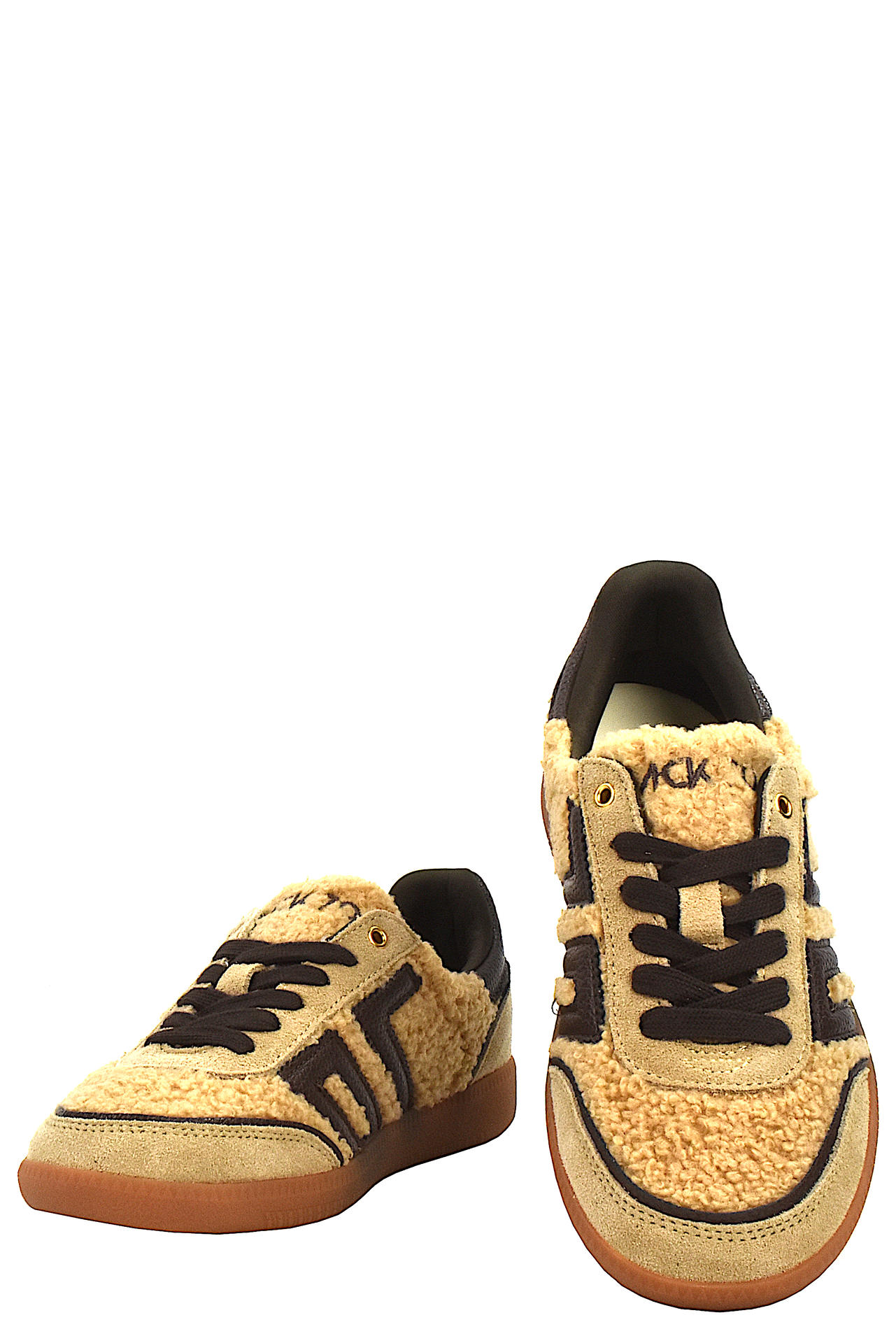 SNEAKER STRINGATA IN PELLE, CAMOSCIO E TESSUTO "TEDDY". PLANTARE INTERNO ESTRAIBILE. TACCO 25, FONDO GOMMA.