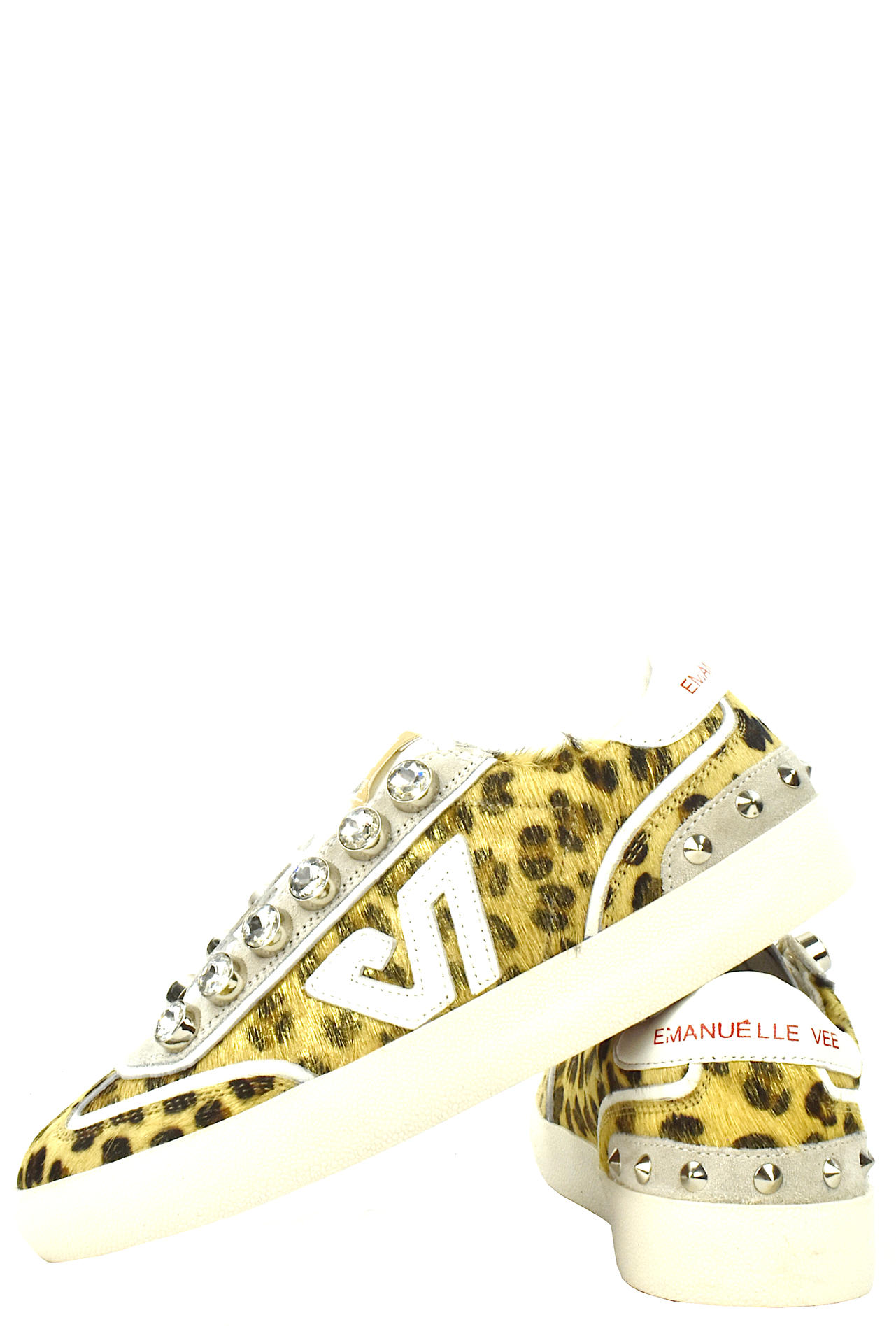 SNEAKER STRINGATA IN PELLE E CAVALLINO ANIMALIER CON DETTAGLI IN CAMOSCIO E BORCHIE. TACCO 25, FONDO GOMMA.