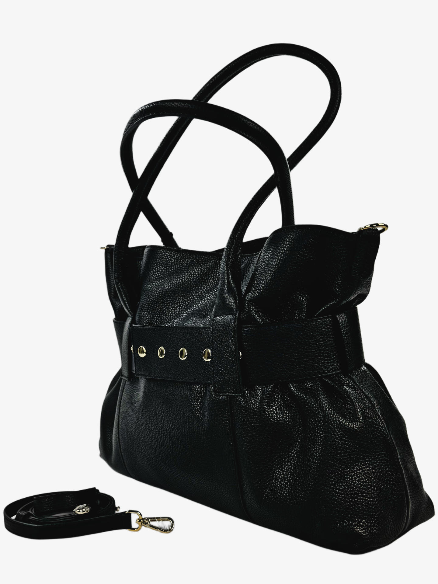 BORSA IN PELLE CON BOTTONE MAGNETICO DI CHIUSURA. INTERNO FODERATO E CON TASCHE. MANICI LUNGHI DA PORTARE A SPALLA E TRACOLLA IN PELLE INCLUSA. FASCIA DESIGN INTORNO ALLA BORSA CHE PUò ESSERE STACCATA ED UTILIZZATA COME FUSCIACCA/CINTURA. MISURE 43X29X12. MADE IN ITALY