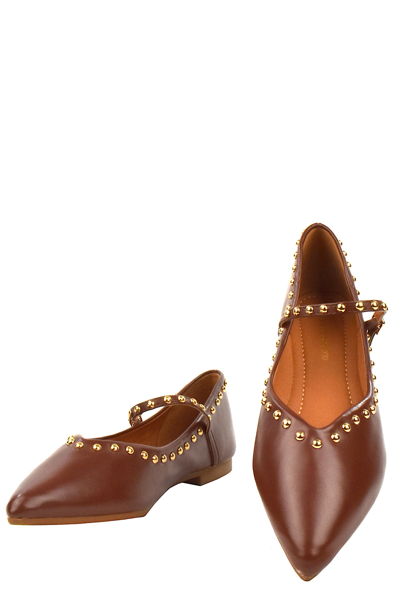 SCARPA IN PELLE CON APPLICAZIONE DI BORCHIETTE. CINTURINO REGOLABILE. COSTRUZIONE A SACCHETTO SUPER FLESSIBILE. TACCO 10, FONDO GOMMA.