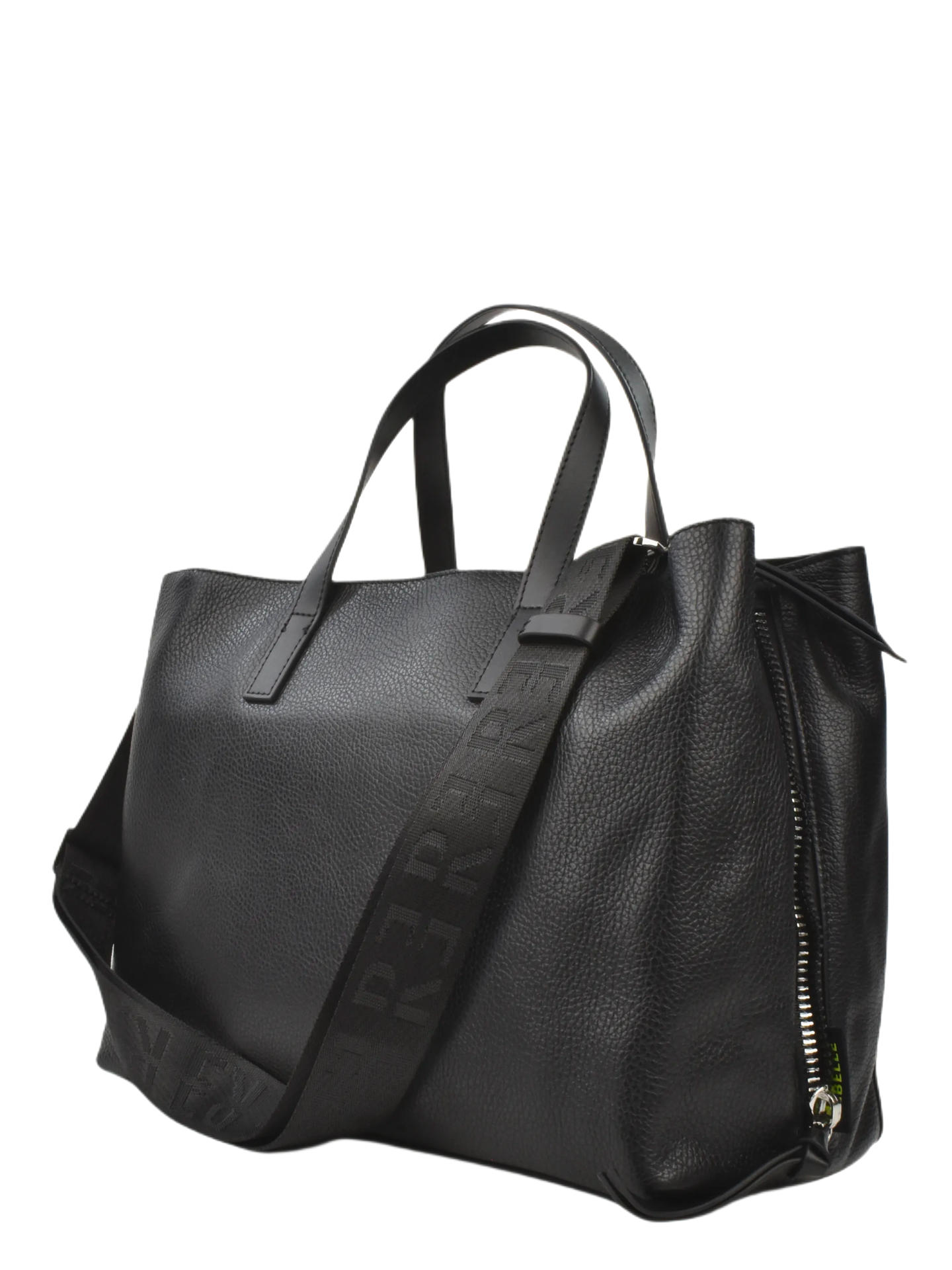 BORSA IN PELLE CON ZIP DI CHIUSURA. INTERNO FODERATO E CON TASCHE. TRACOLLA IN TESSUTO TECNICO REGOLABILE E STACCABILE. MISURE 35X25X16