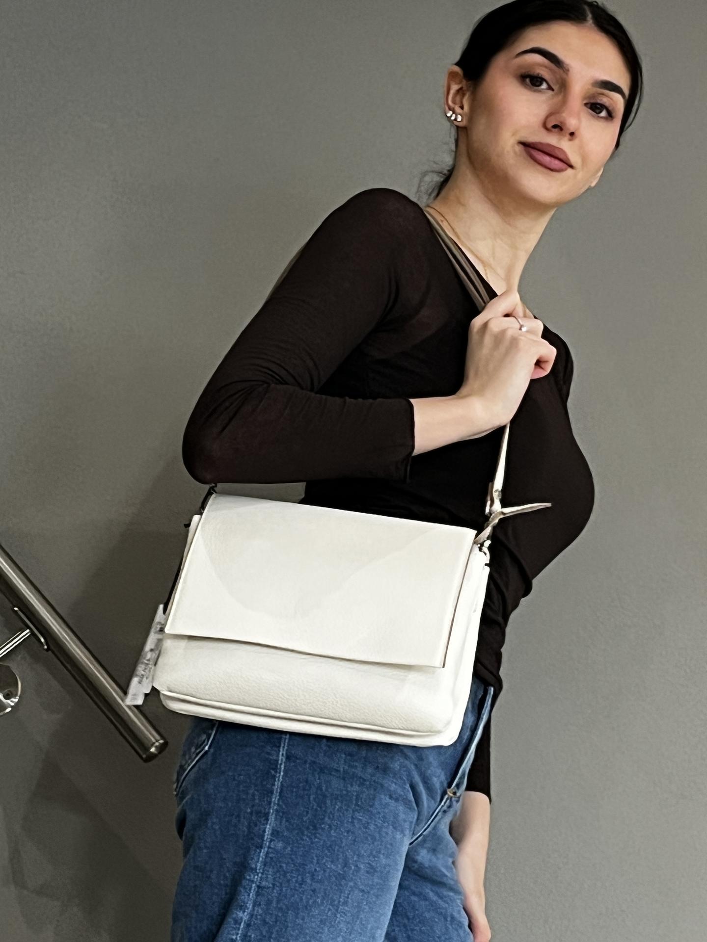 BORSA IN PELLE CON PATTA E BOTTONE MAGNETICO DI CHIUSURA. ZIP DI CHUSURA ED INTERNO SUDDIVISO IN DUE AMPIE TASCHE. INTERNO FODERATO. TASCA FRONTALE CON ZIP. TRACOLLA IN PELLE REGOLABILE. MISURE 25,5X20X6