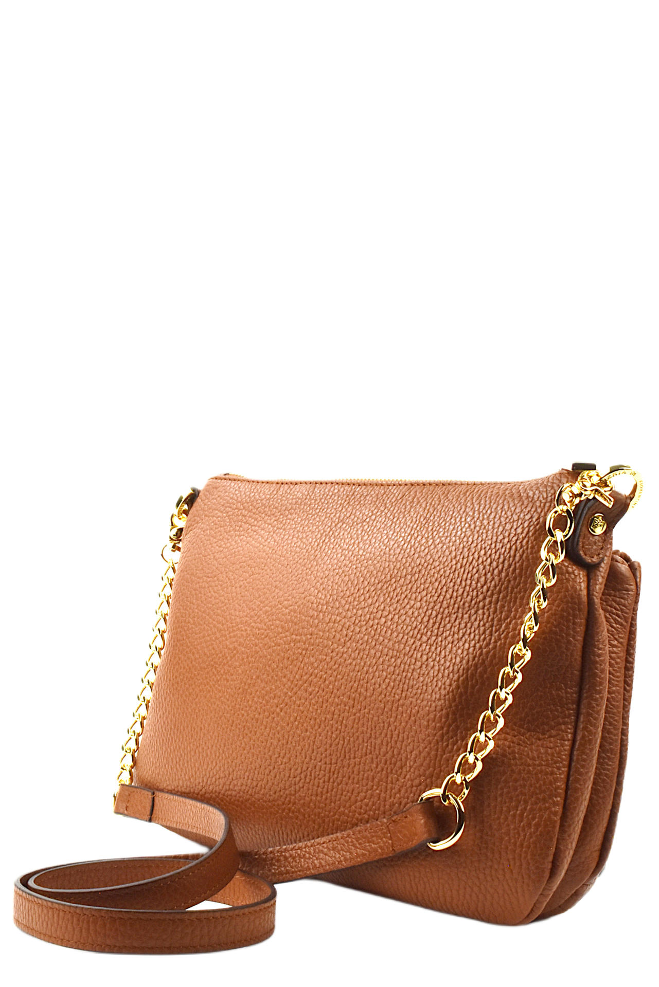 BORSA IN PELLE CON DUE TASCHE CON ZIP DI CHIUSURA. INTERNO FODERATO E CON FESSURE. TRACOLLA IN PELLE E CATENINA AGLI ESTREMI. MISURE 28X18X5. MADE IN ITALY