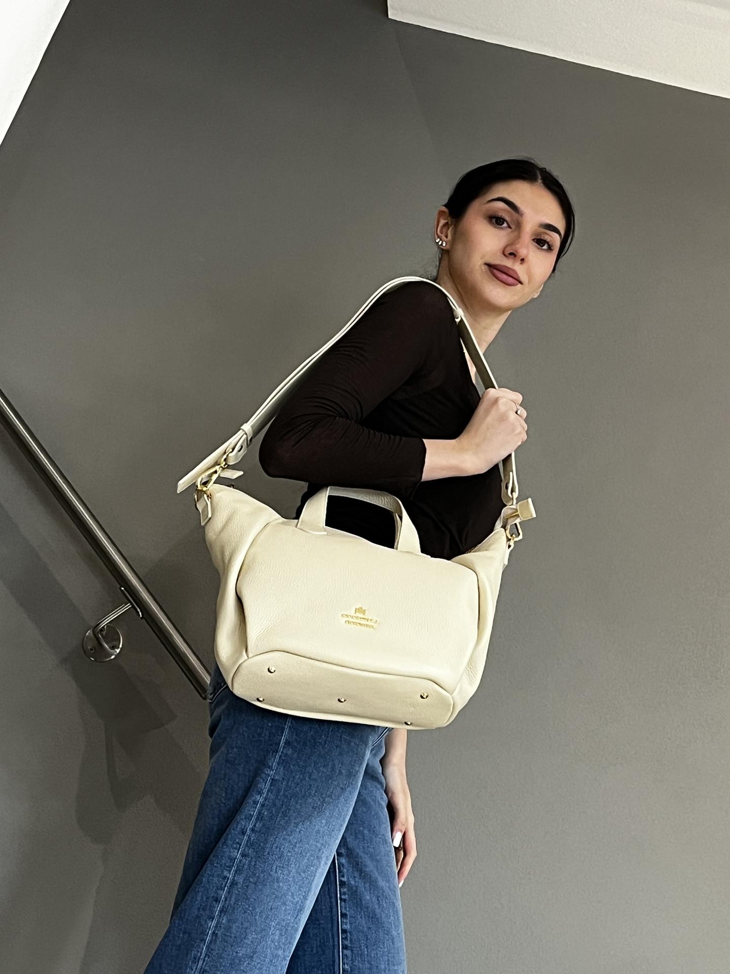 BORSA "CAROL" IN PELLE CON AMPIA ZIP DI CHIUSURA. INTERNO FODERATO E CON TASCHE. TRACOLLA IN PELLE IN TINTA, REGOLABILE, INCLUSA. MISURE 25X25X14. MADE IN ITALY
