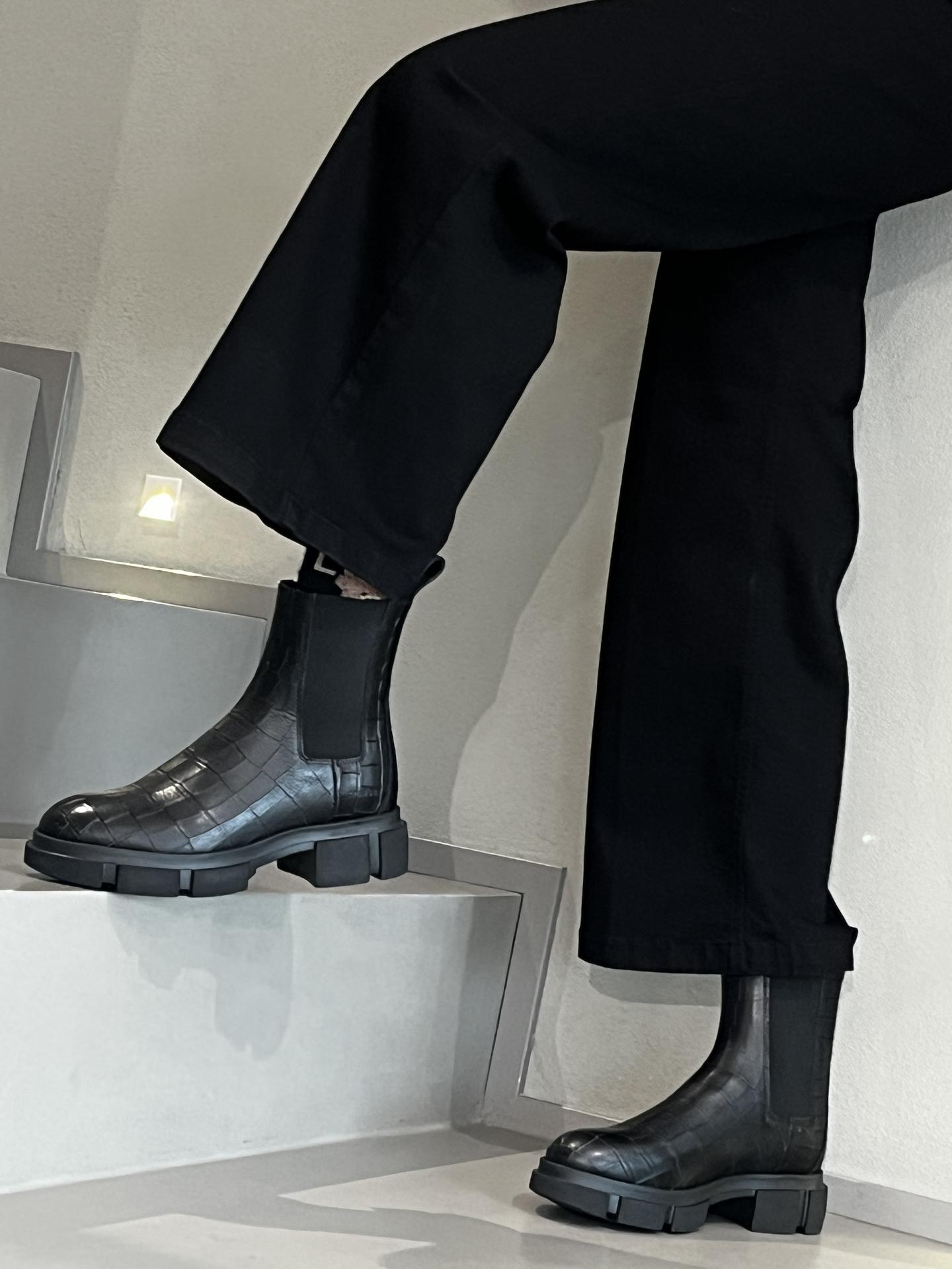STIVALETTO IN PELLE STAMPATA CON INSERTI ELASTICI SU AMBO I LATI. PLANTARE INTERNO ESTRAIBILE. TACCO 45, FONDO GOMMA.