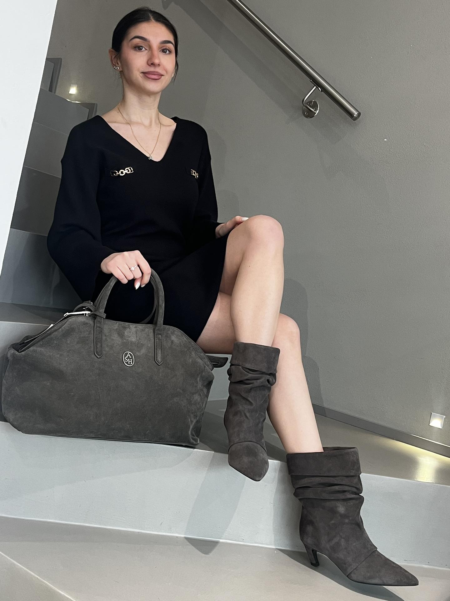 STIVALE IN CAMOSCIO DRAPPEGGIATO E RISVOLTABILE CON ENTRATA TUBOLARE SENZA ZIP. MISURA DEL GAMBALE (DAL TALLONE COMPRESO IN SU E SENZA RISVOLTO) 250. TACCO 50, FONDO CUOIO E GOMMA.