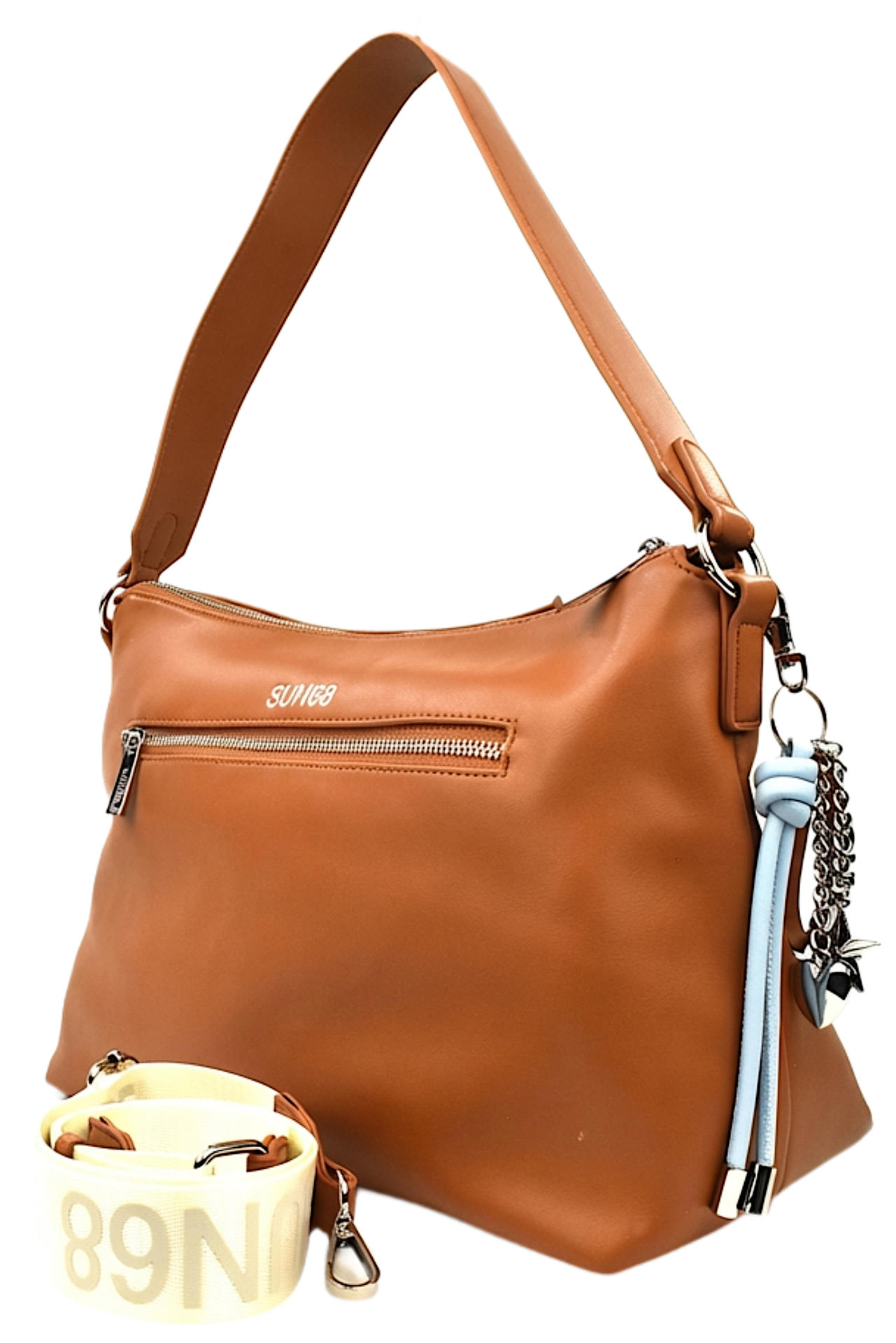 BORSA IN SIMIL PELLE CON ZIP DI CHIUSURA. INTERNO FODERATO E CON TASCHE. TRACOLLA CORTA E LUNGA IN TESSUTO LOGATO REGOLABILE E STACCABILE. CHARMS STACCABILE. MISURE 34X24,5X14