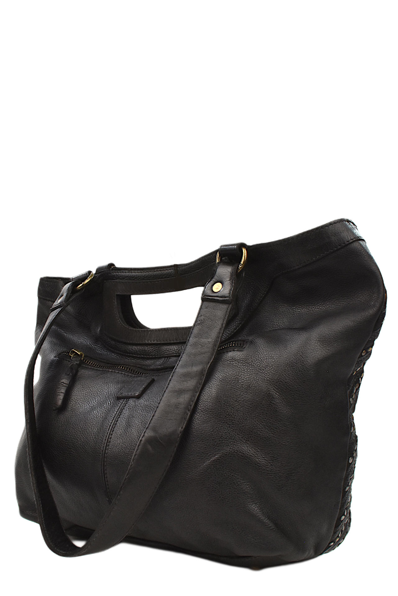 BORSA IN PELLE EFFETTO VINTAGE CON APPLICAZIONI E BOTTONE MAGNETICO DI CHIUSURA. INTERNO FODERATO E CON TASCHE. STRATEGICA TASCA CON ZIP SUL RETRO. MISURE 29X30X11