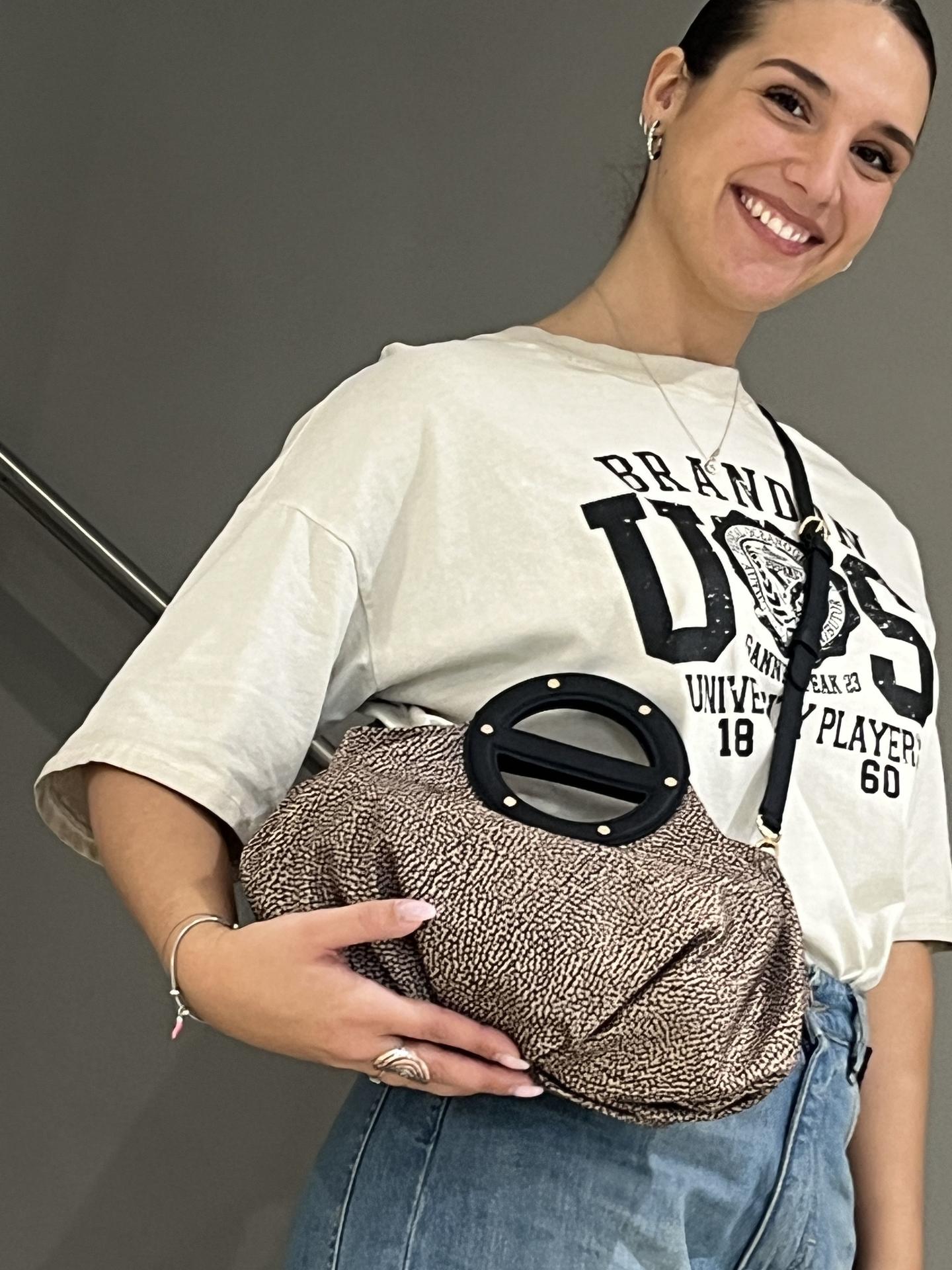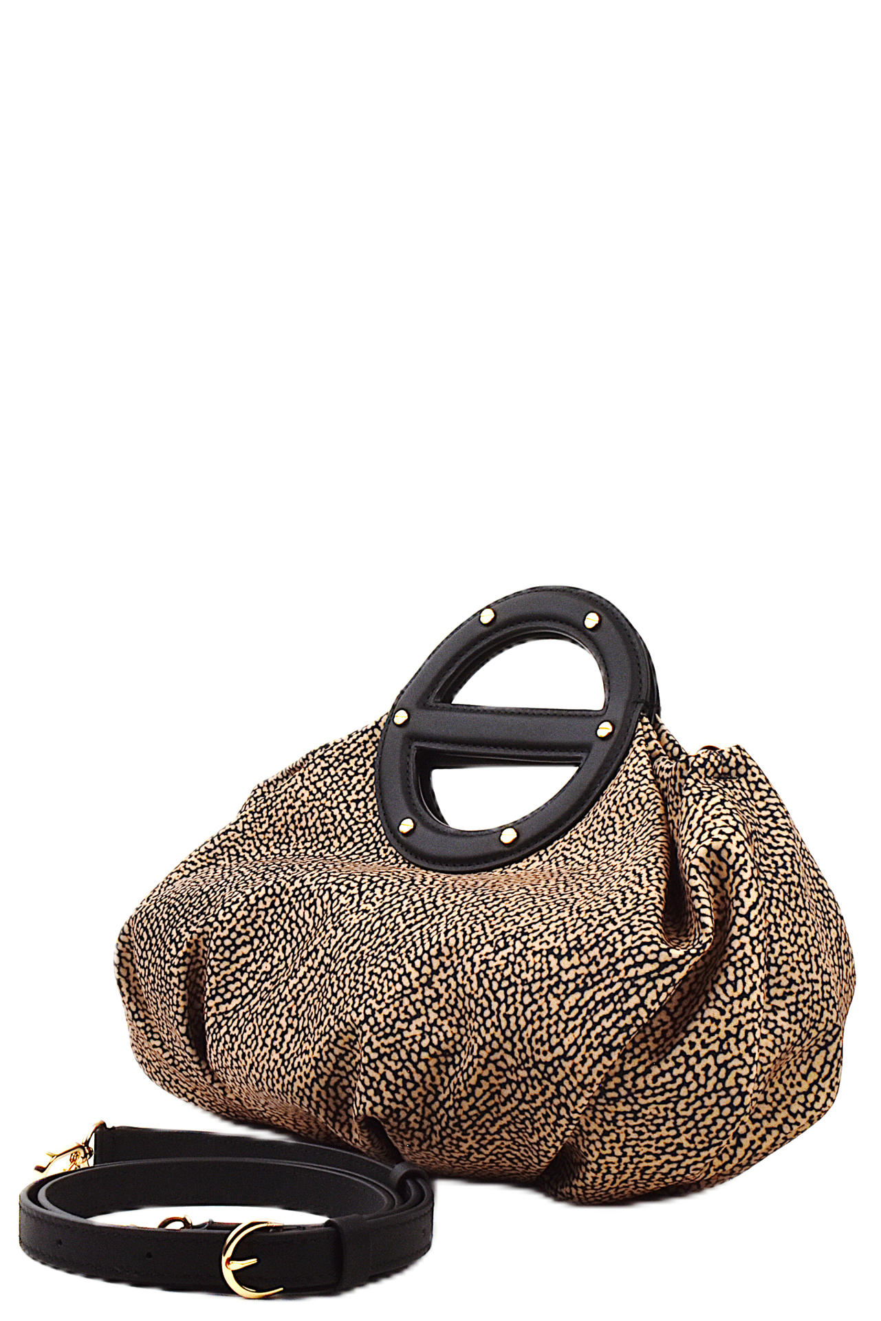 BORSA IN TESSUTO TECNICO STAMPATO EFFETTO TAPIRO CON RIFINITURE IN PELLE E MAGNETE DI CHIUSURA. INTERNO FODERATO E CON TASCHE. TRACOLLA IN PELLE INCLUSA (CON MOSCHETTONI AGLI ESTREMI). MISURE 32X19X14