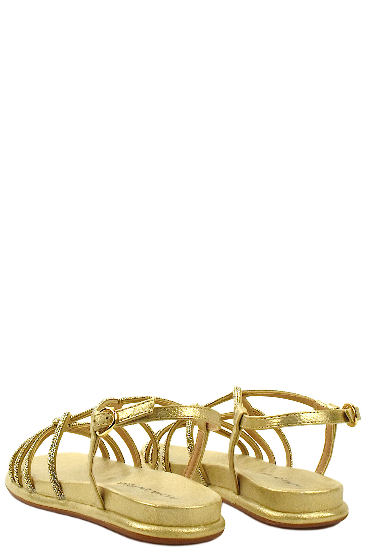 SANDALO CON EFFETTO PERLATO E APPLICAZIONI DI STRASS. CINTURINO REGOLABILE SUL RETRO. MORBIDO PLANTARE. TACCO (+PLANTARE) 25, FONDO GOMMA.