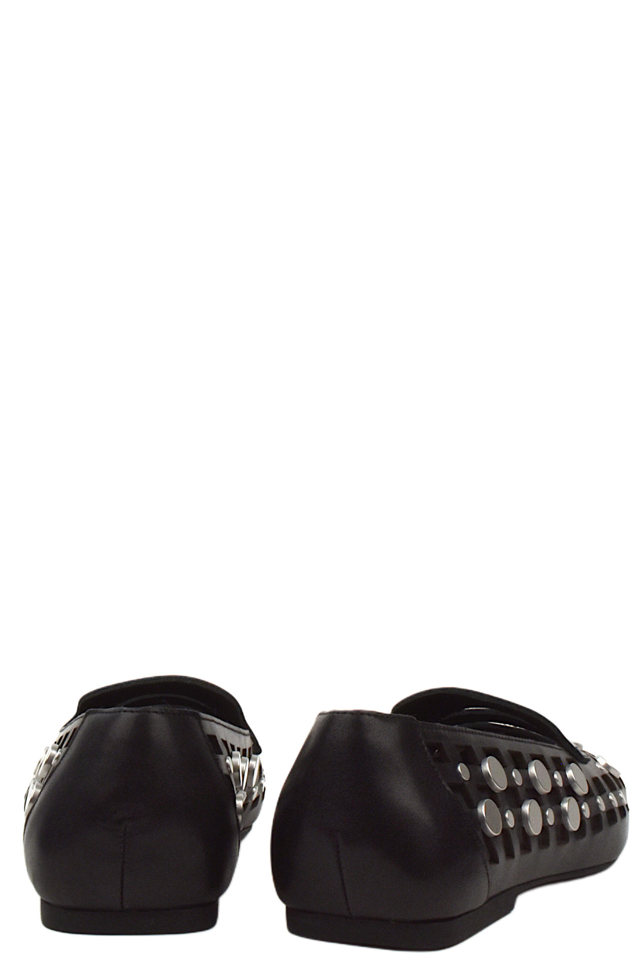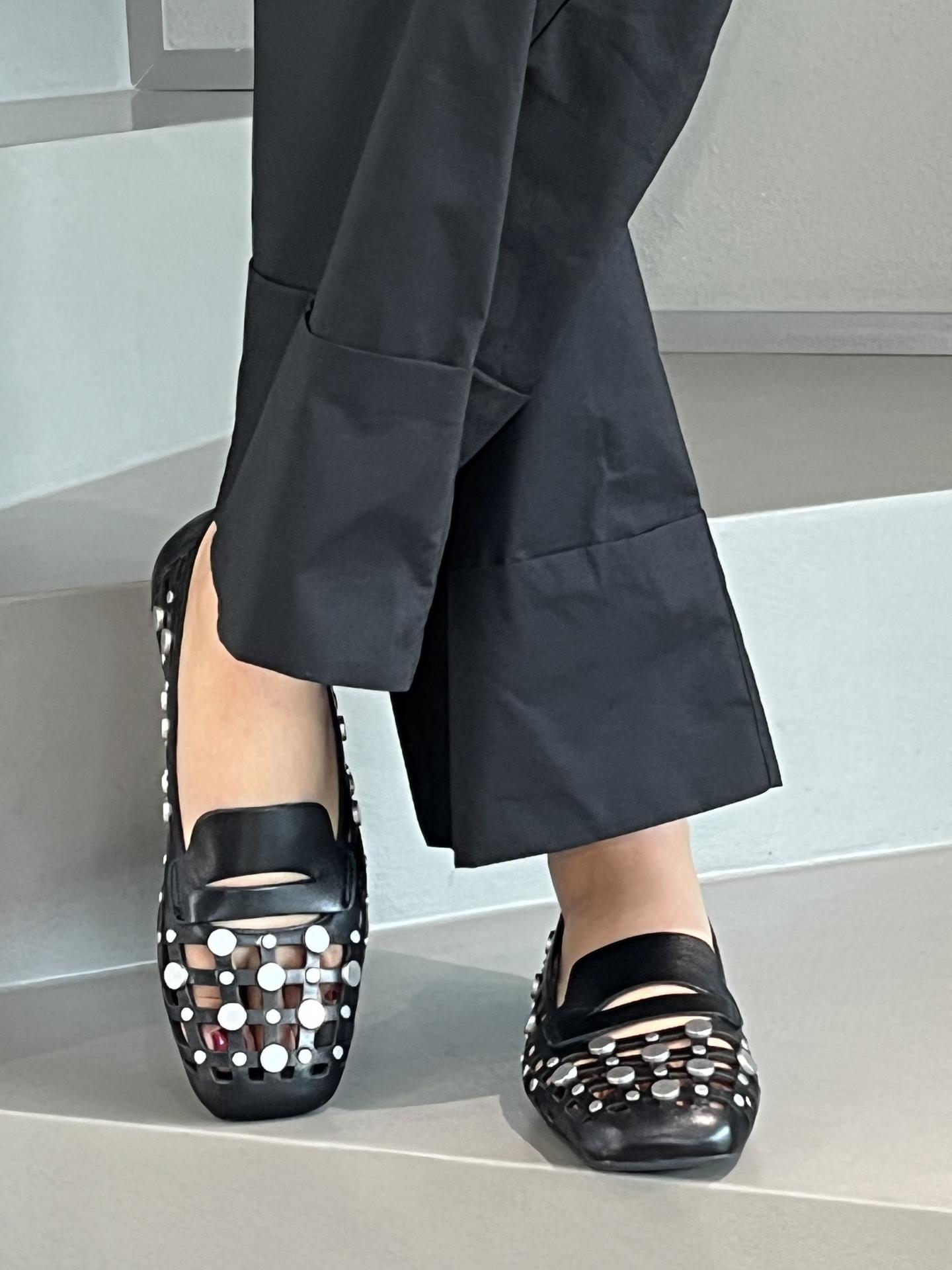 SCARPA IN PELLE DESIGN CON APERTURE E APPLICAZIONE DI BORCHIE PIATTE. MORBIDO SOTTOPIEDE IN PELLE. TACCO 10, FONDO GOMMA.