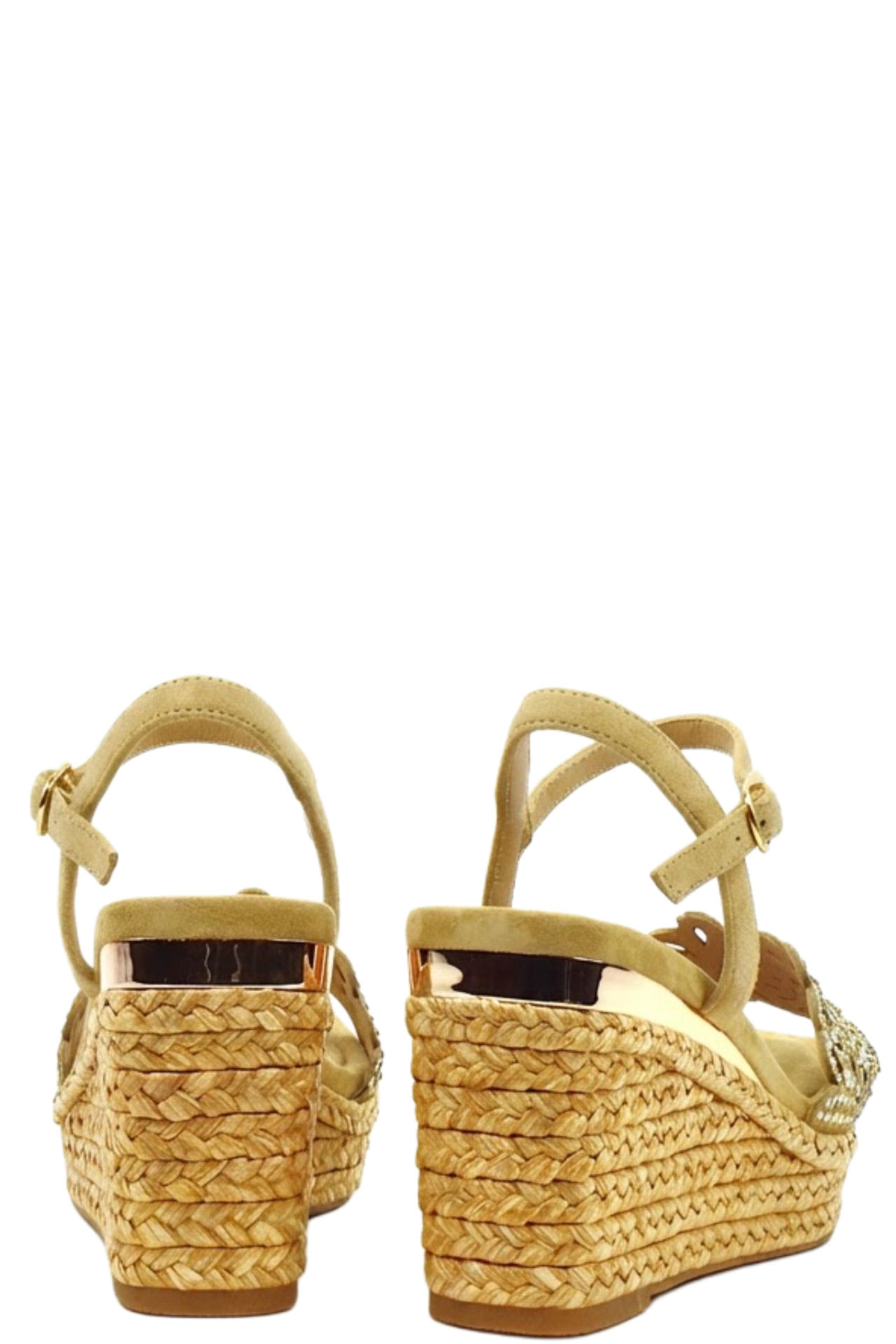 SANDALO IN CAMOSCIO CON APPLICAZIONE DI STRASS E CINTURINO ALLA CAVIGLIA. MORBIDO SOTTOPIEDE. ZEPPA IN RAFFIA INTRECCIATA. TACCO 90, PLATFORM 35, FONDO GOMMA.