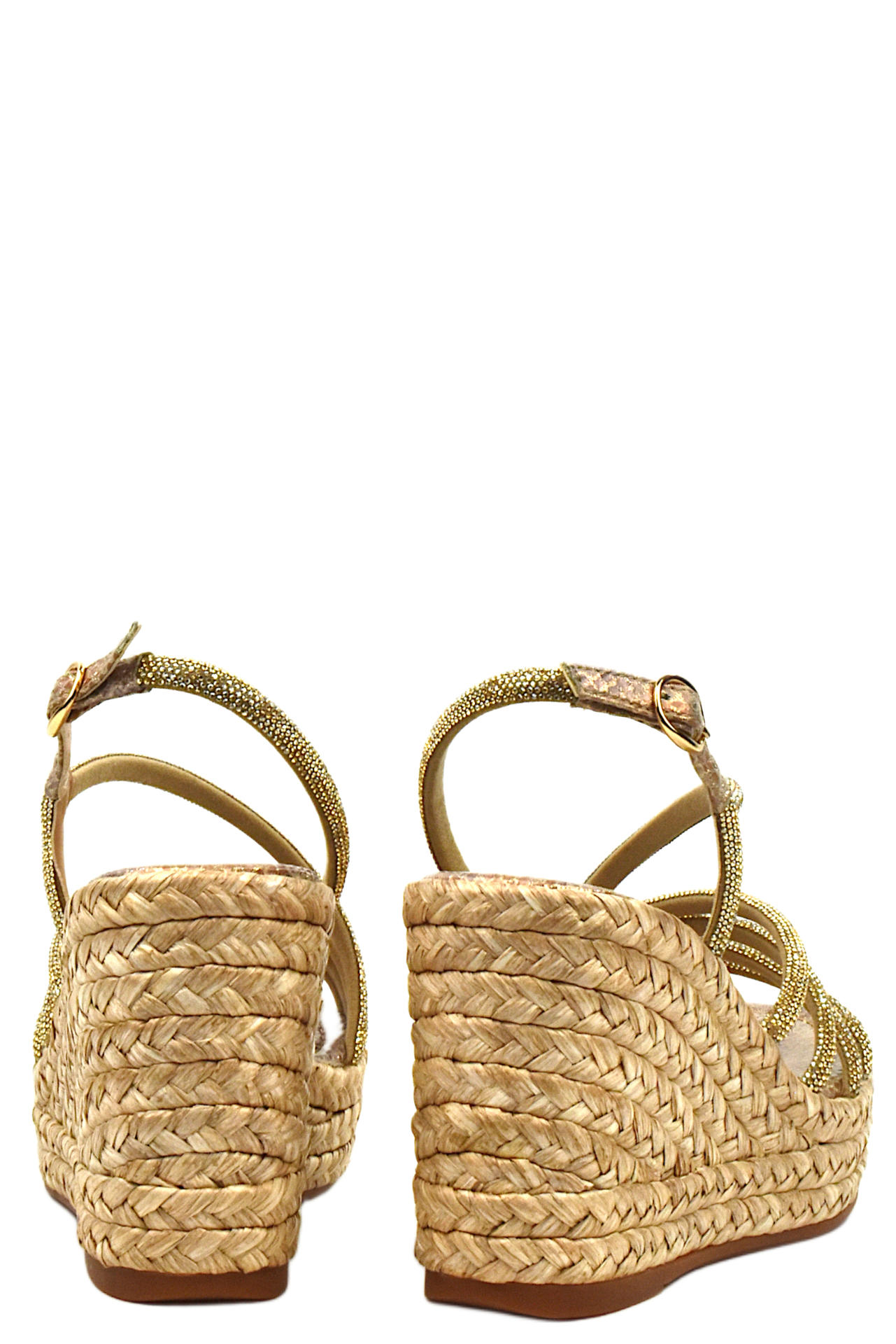 SANDALO IN ECO PELLE STAMPATA EFFETTO RETTILE E APPLICAZIONE DI STRASS. CINTURINO REGOLABILE PER UNA PERFETTA AVVOLGENZA. MORBIDO SOTTOPIEDE. ZEPPA IN RAFFIA INTRECCIATA. TACCO 90, PLATFORM 35, FONDO GOMMA.