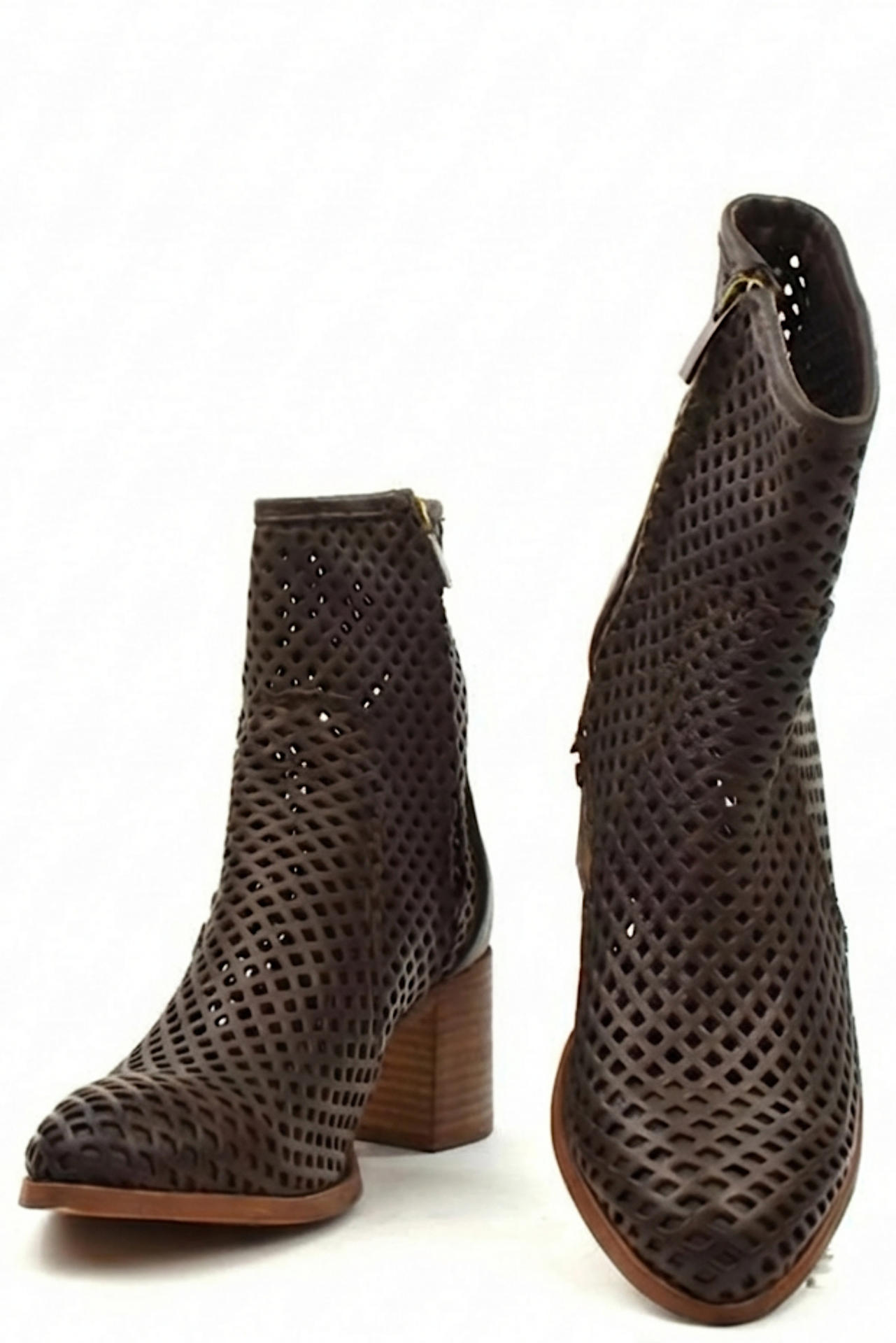 STIVALETTO IN PELLE TRAFORATA CON ZIP SU LATO INTERNO E FODERA RINFORZATA AGLI ESTREMI (PUNTA E TALLONE). TACCO 60, FONDO GOMMA. MADE IN ITALY