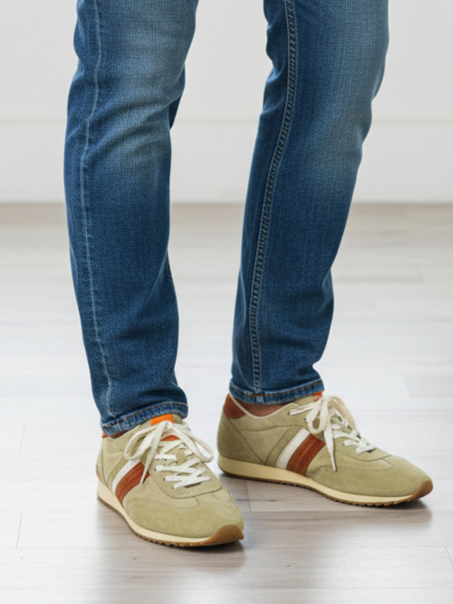 SNEAKER STRINGATA IN CAMOSCIO E TESSUTO TECNICO CON RIFINITURE IN PELLE. MORBIDO PLANTARE INTERNO ESTRAIBILE. TACCO 20, FONDO GOMMA. MADE IN ITALY