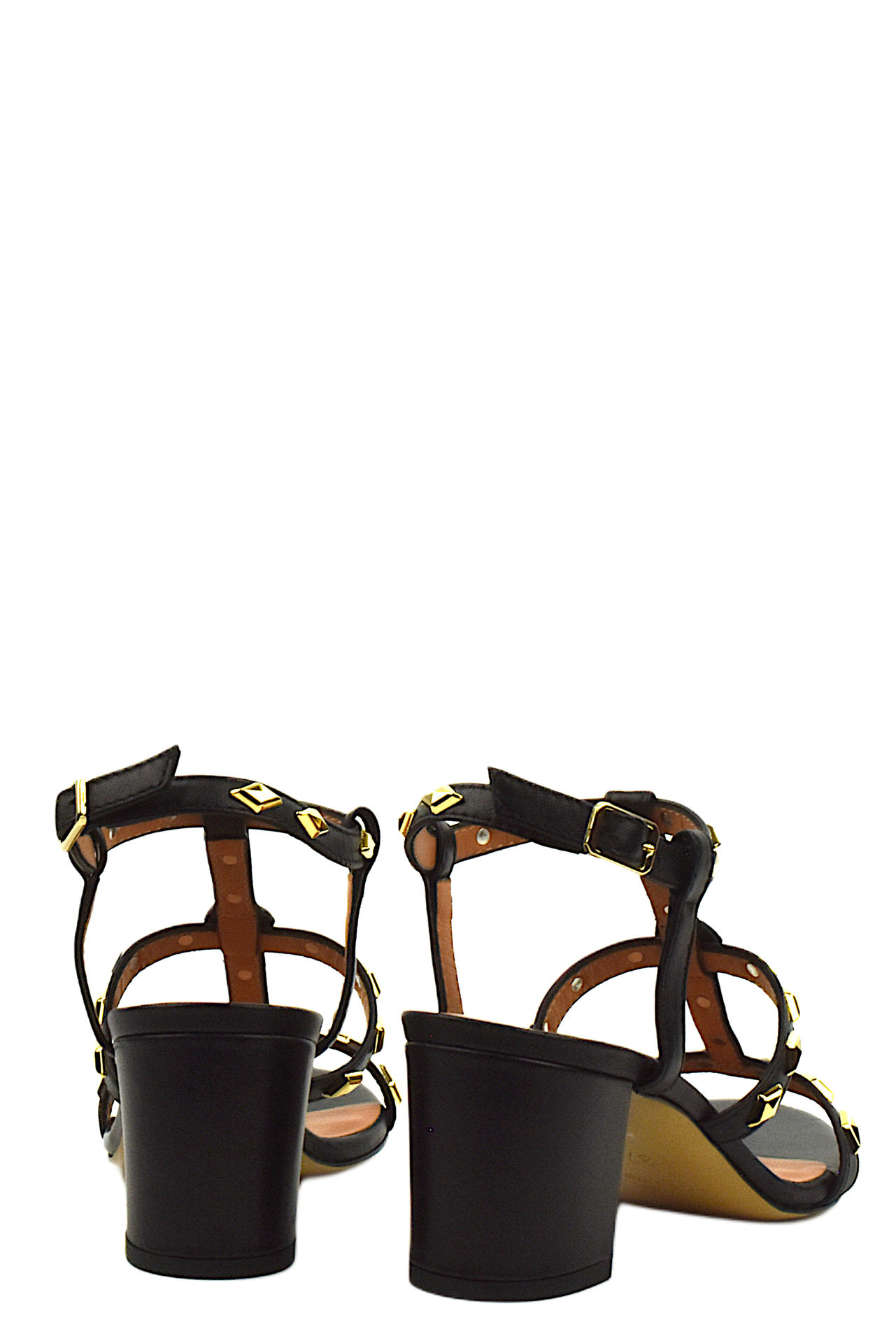 SANDALO IN PELLE CON APPLICAZIONE DI BORCHIETTE DESIGN E CINTURINO REGOLABILE. TACCO 60, FONDO CUOIO. MADE IN ITALY