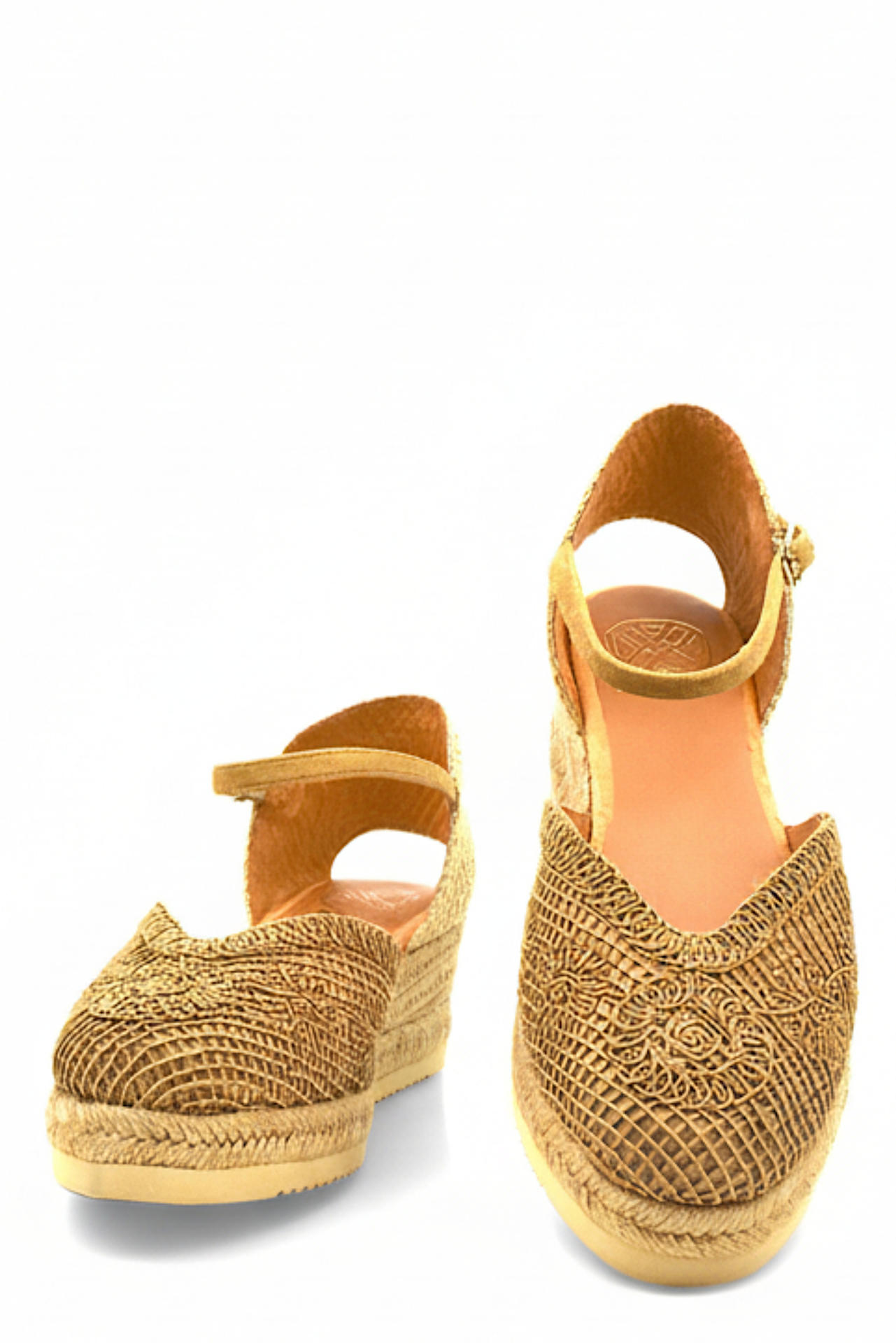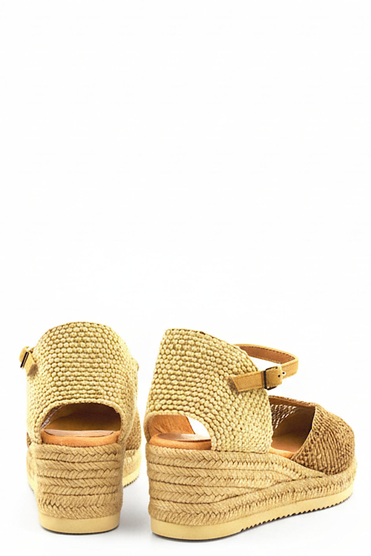SANDALO IN TESSUTO LAVORATO CON CINTURINO IN CAMOSCIO. RIFINITURE IN CORDA INTRECCIATA. TACCO 50, PLATFORM 20, FONDO GOMMA.