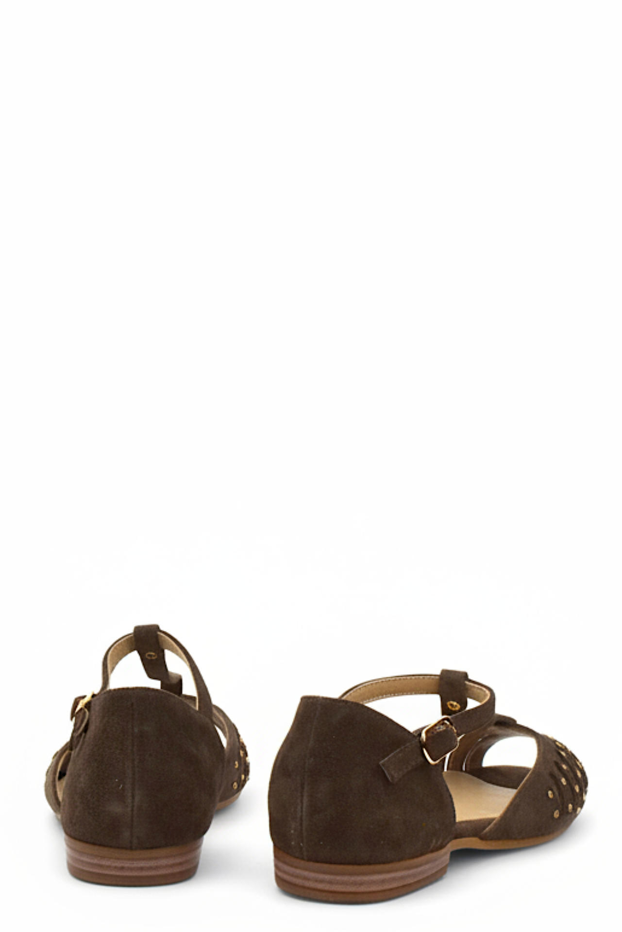 SCARPA IN CAMOSCIO E PELLE CON APPLICAZIONE DI BORCHIETTE. CINTURINO REGOLABILE. TACCO 15, FONDO GOMMA.