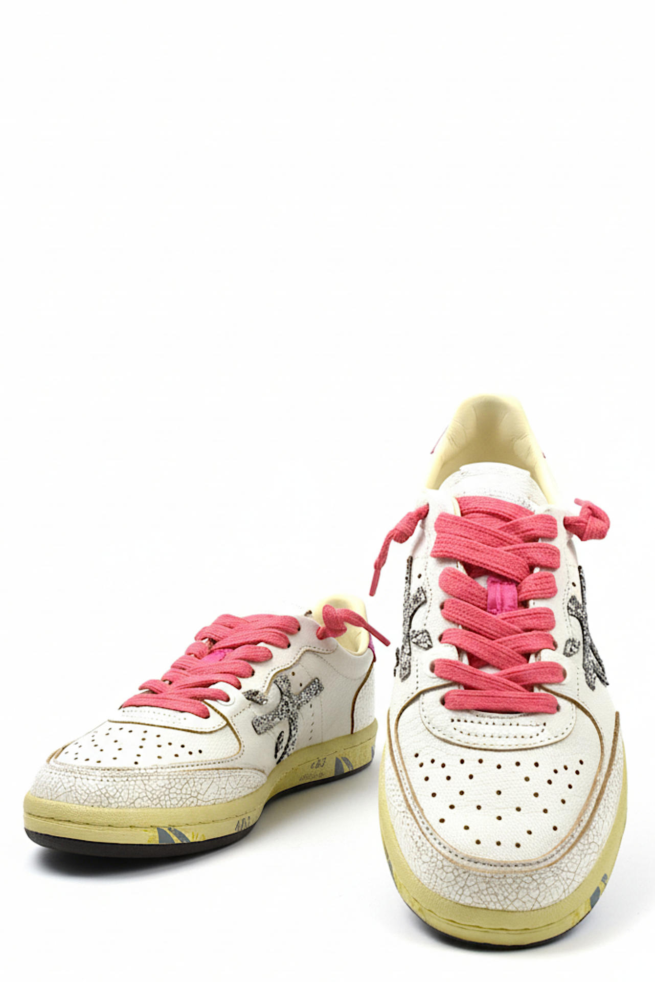 SNEAKER STRINGATA IN PELLE E PELLE CRACCATA AGLI ESTREMI. DETTAGLIO IN GLITTER LATERALE E IN PELLE STAMPATA COCCO FUXIA SUL RETRO. MORBIDO PLANTARE INTERNO ESTRAIBILE. TACCO 25, FONDO GOMMA.