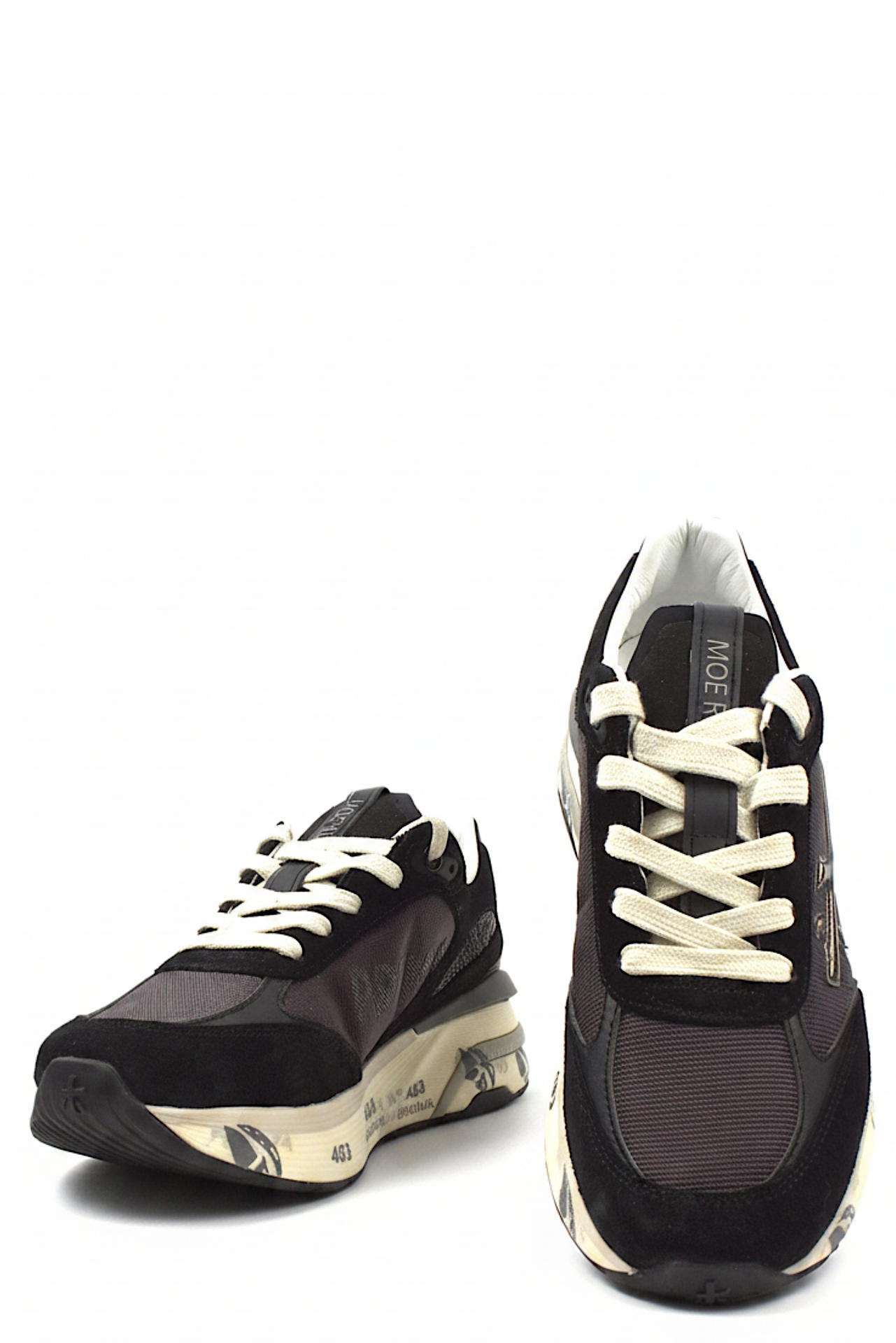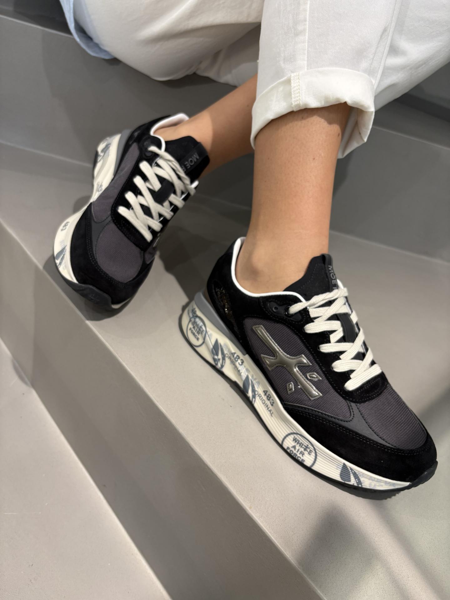 SNEAKER STRINGATA IN CAMOSCIO, PELLE E TESSUTO TECNICO. INSERTO IN PAILLETTES SUI LATI POSTERIORI. PLANTARE INTERNO ESTRAIBILE. TACCO (+STABILIZZATORE) 45, FONDO GOMMA LIGHT.