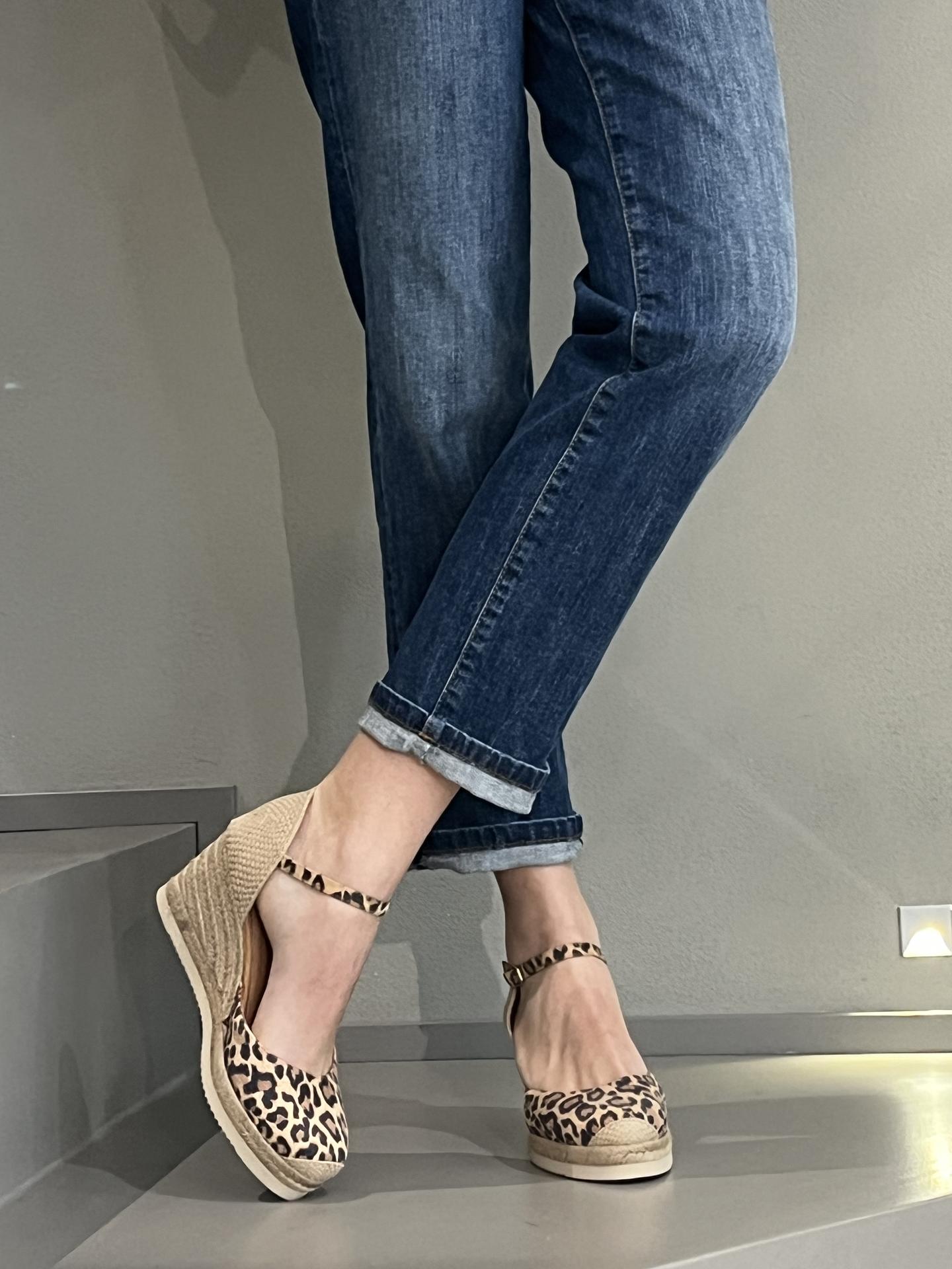 SANDALO CON CINTURINO IN CAMOSCIO STAMPATO E CORDA. ZEPPA IN CORDA INTRECCIATA. TACCO 75, PLATFORM 20, FONDO GOMMA.