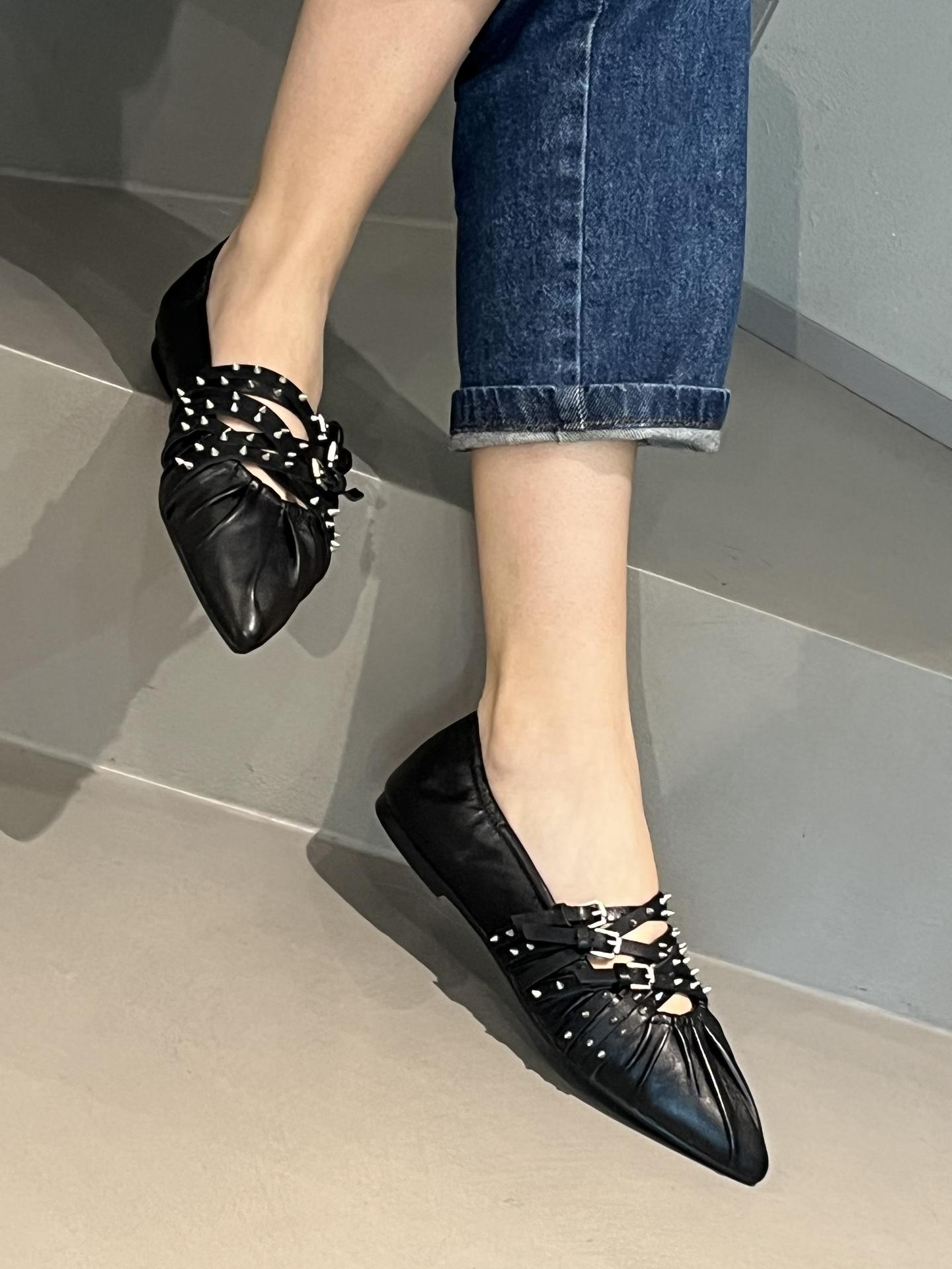 SCARPA IN MORBIDA PELLE CON APPLICAZIONE DI BORCHIETTE SU CINTURINI REGOLABILI. COSTRUZIONE A SACCHETTO SUPER FLESSIBILE. TACCO 10, FONDO GOMMA.