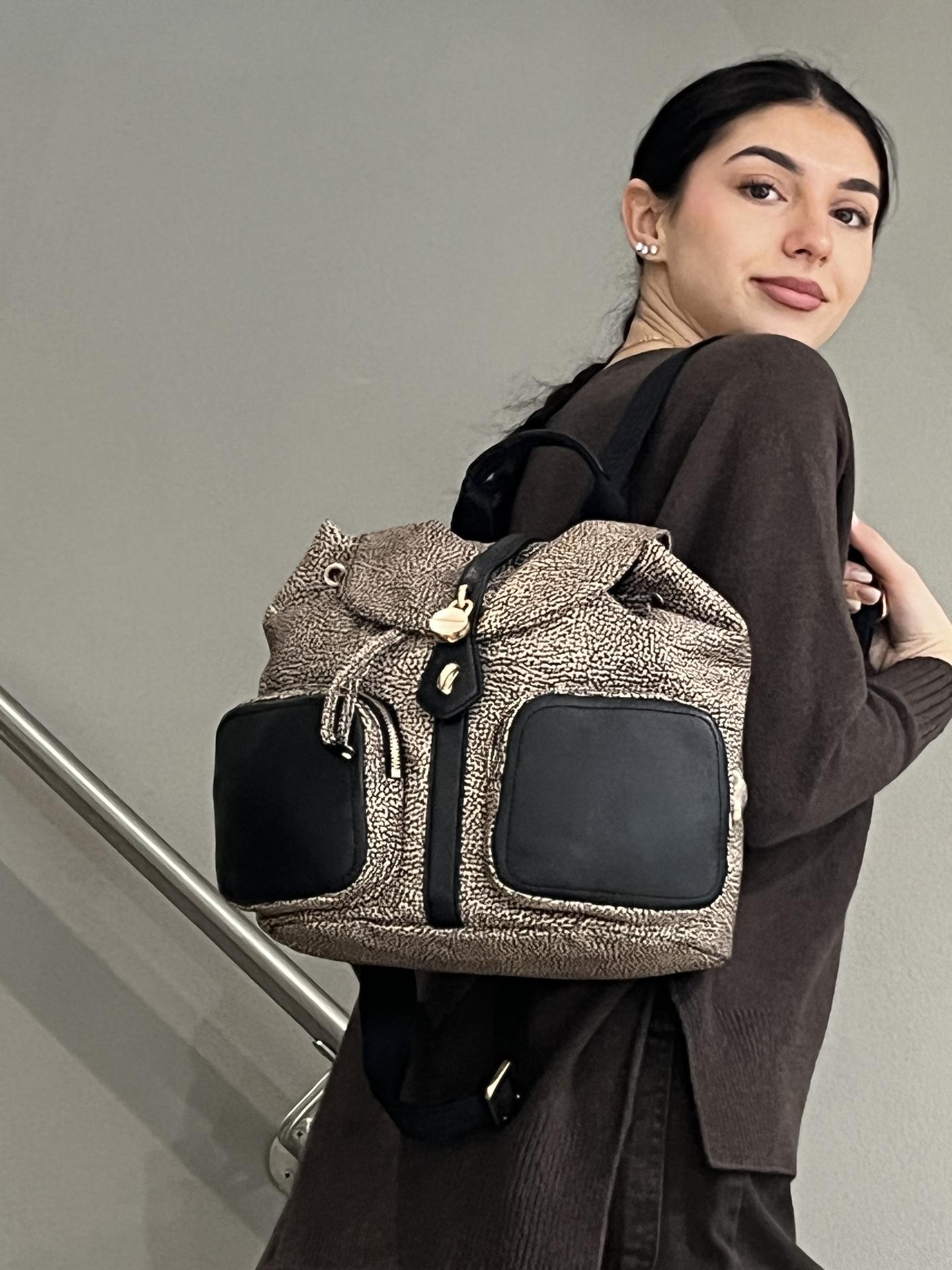 ZAINO IN TESSUTO TECNICO CON STAMPA TAPIRO E RIFINITURE IN PELLE. PATTA CON GANCIO DI CHIUSURA E COULISSE. INTERNO FODERATO. SPALLACCI IN TESSUTO REGOLABILI. TASCHE FRONTALI CON ZIP. MISURE 23X25X13