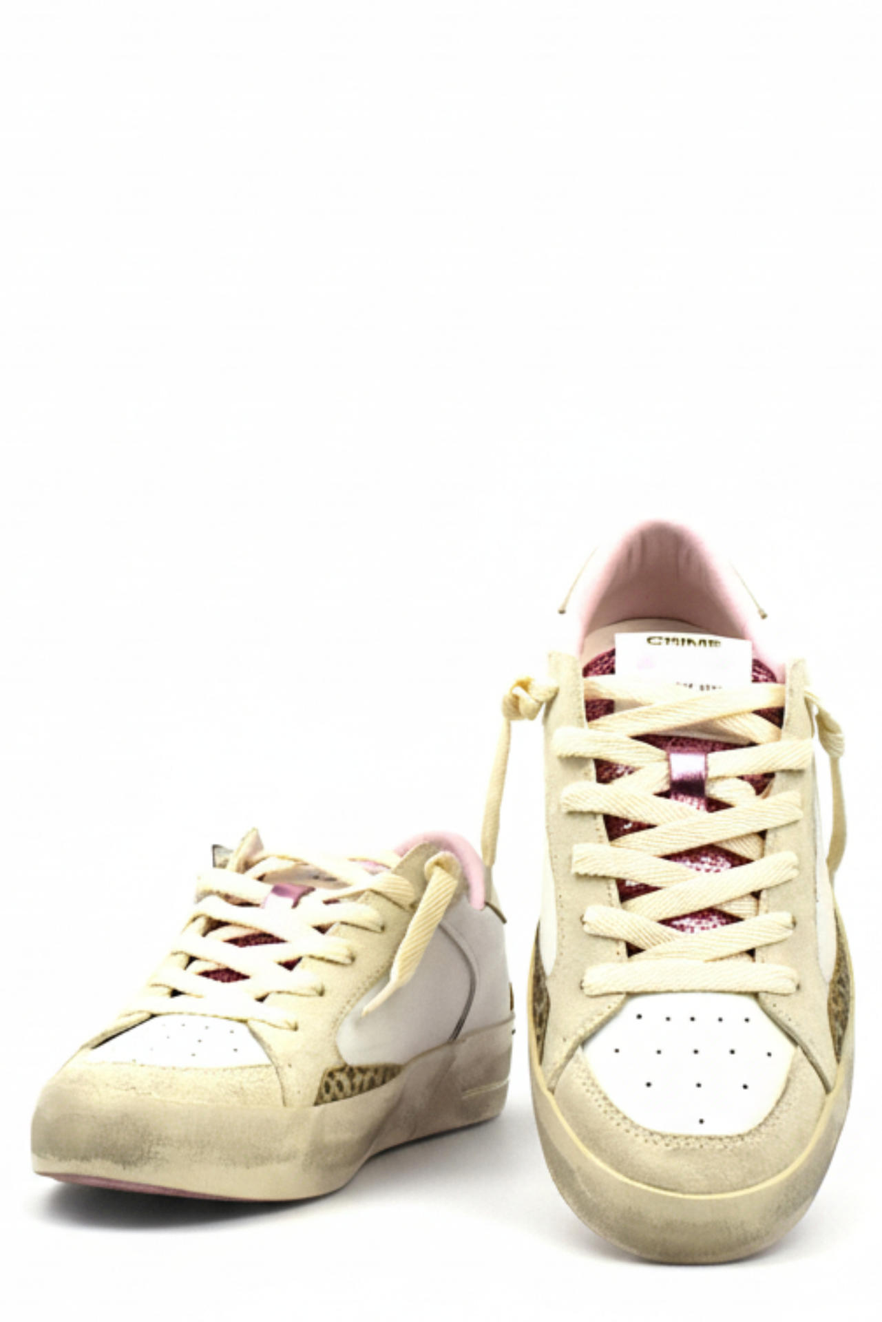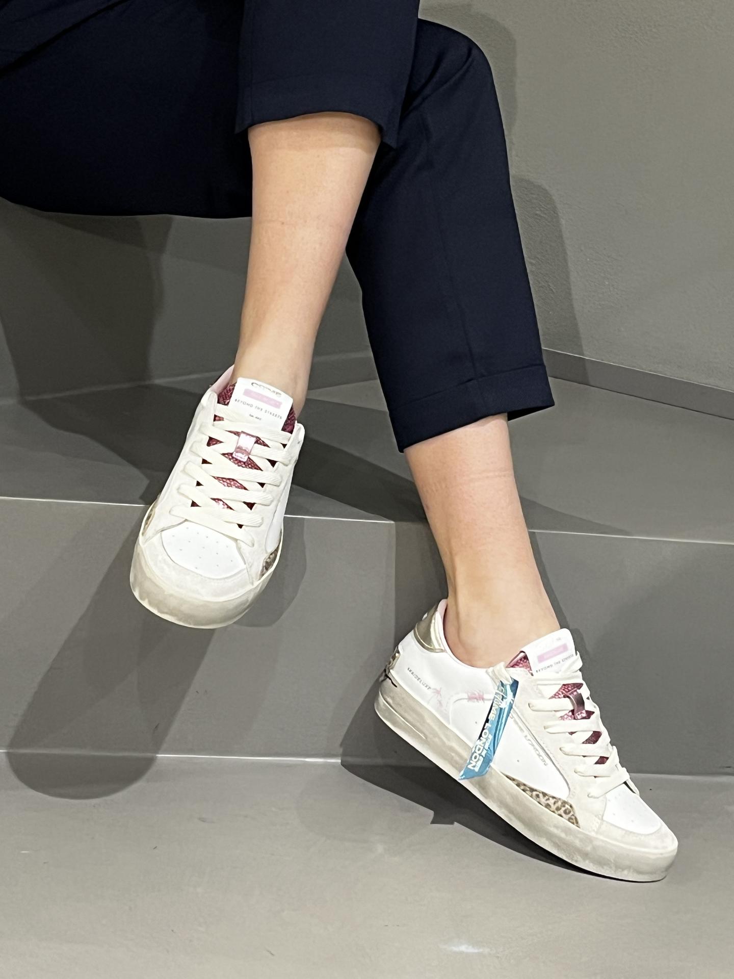 SNEAKER STRINGATA IN PELLE E CAMOSCIO CON DETTAGLI DESIGN E LINGUETTA CON APPLICAZIONE DI PAILLETTES. PLANTARE INTERNO ESTRAIBILE. TACCO 30, FONDO GOMMA.