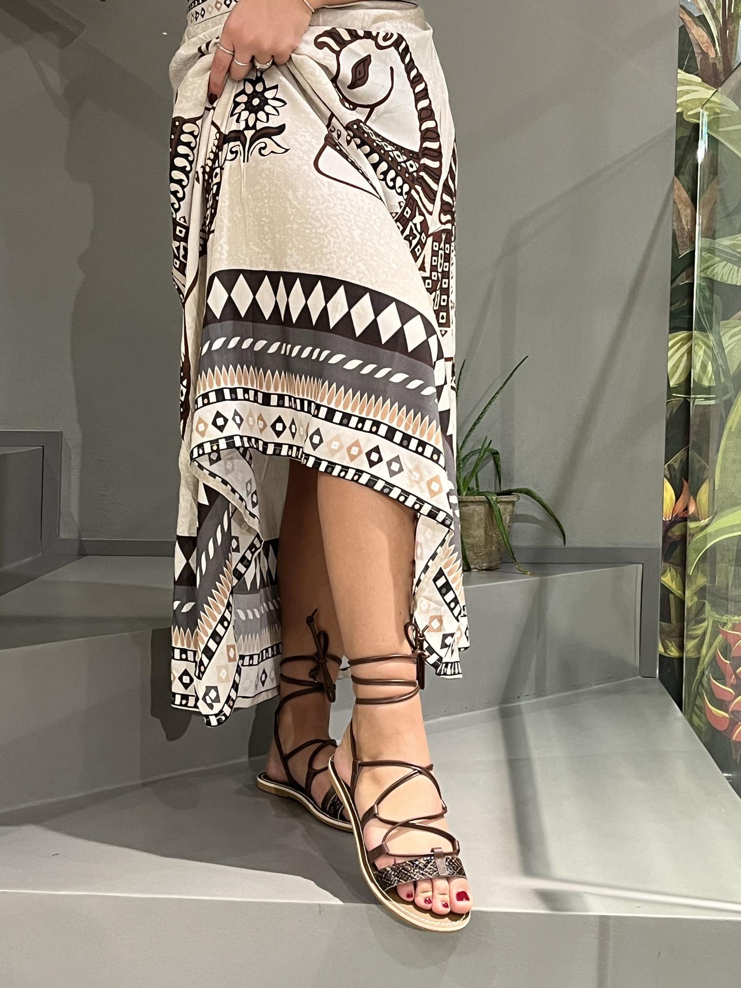 SANDALO IN PELLE ALLACCIATO ALLA CAVIGLIA CON FASCETTA FRONTALE CON LAVORAZIONE DESIGN. TACCO 10, SOTTOPIEDE IN CUOIO, FONDO GOMMA. MADE IN ITALY