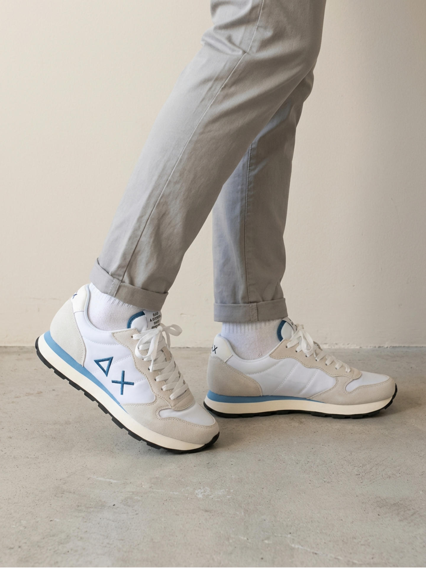 SNEAKER STRINGATA IN CAMOSCIO E TESSUTO TECNICO. PLANTARE INTERNO ESTRAIBILE. TACCO 35, FONDO GOMMA.