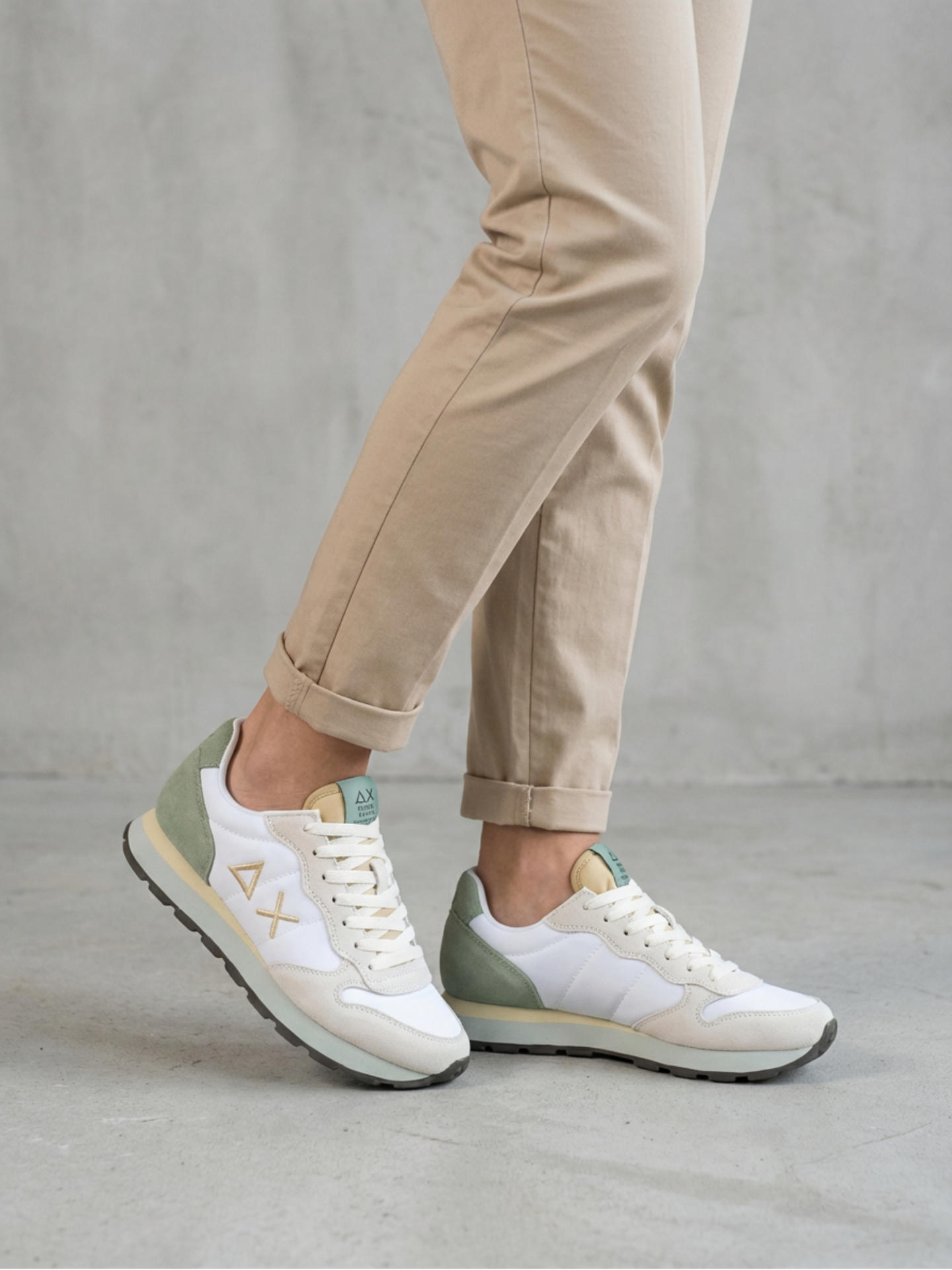 SNEAKER STRINGATA IN CAMOSCIO E TESSUTO TECNICO. PLANTARE INTERNO ESTRAIBILE. TACCO 35, FONDO GOMMA.