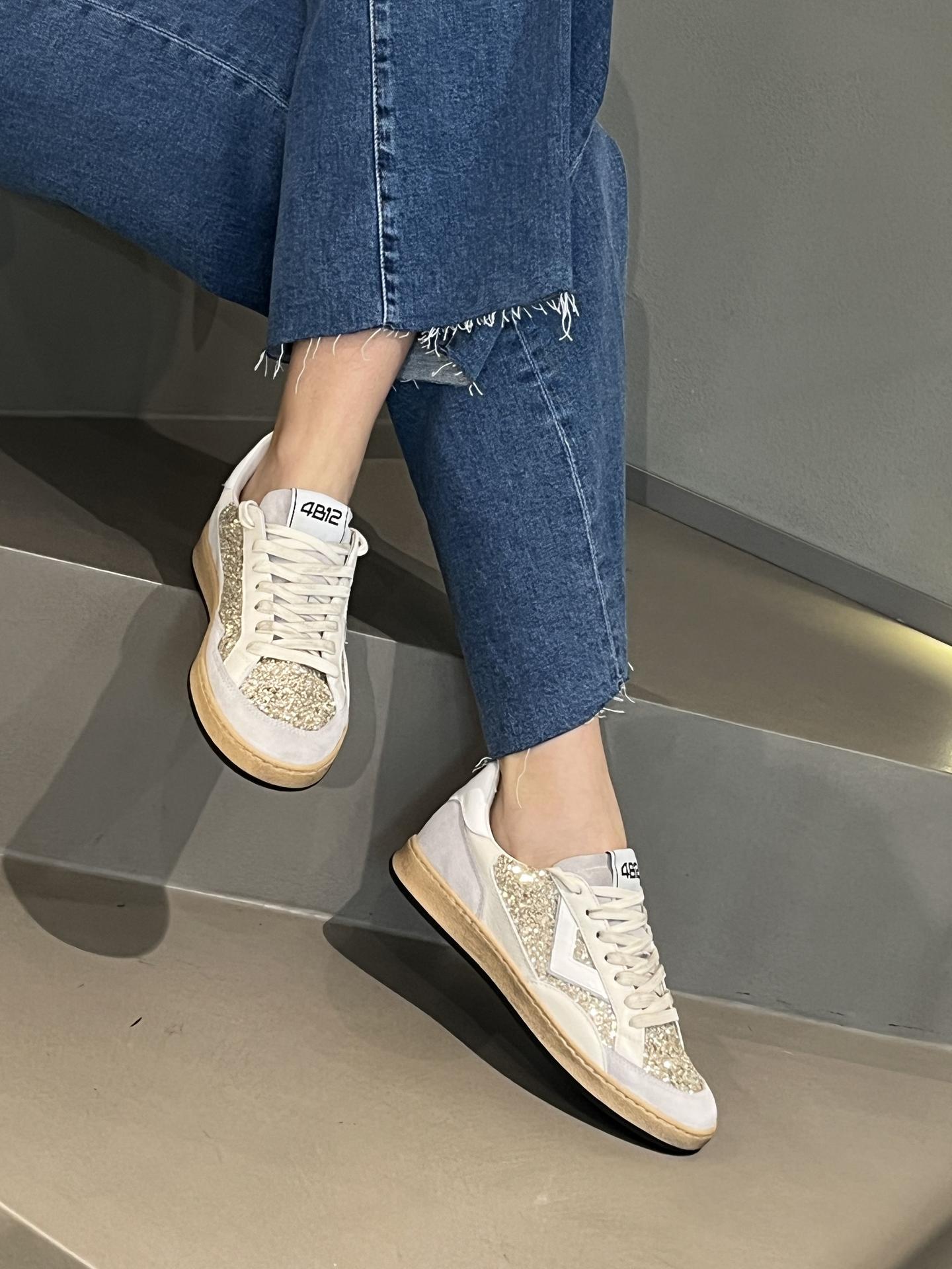 SNEAKER STRINGATA IN CAMOSCIO, PELLE E GLITTER. PLANTARE INTERNO ESTRAIBILE. TACCO 25, FONDO GOMMA. MADE IN ITALY