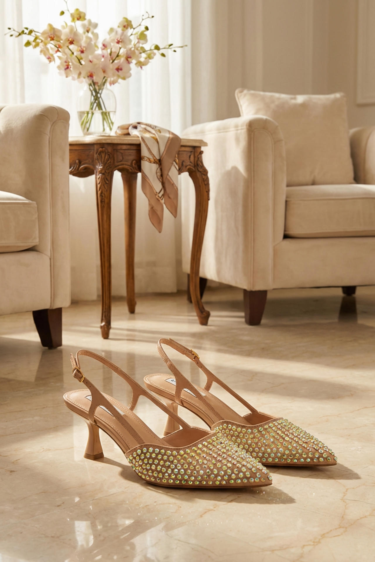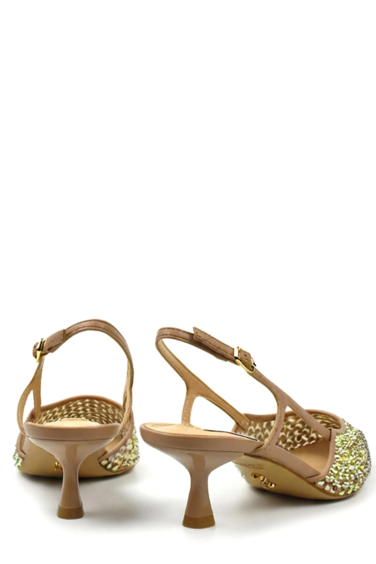 CHANEL IN SIMIL PELLE E TESSUTO CON APPLICAZIONE DI STRASS. CINTURINO REGOLABILE. TACCO 55, FONDO GOMMA.