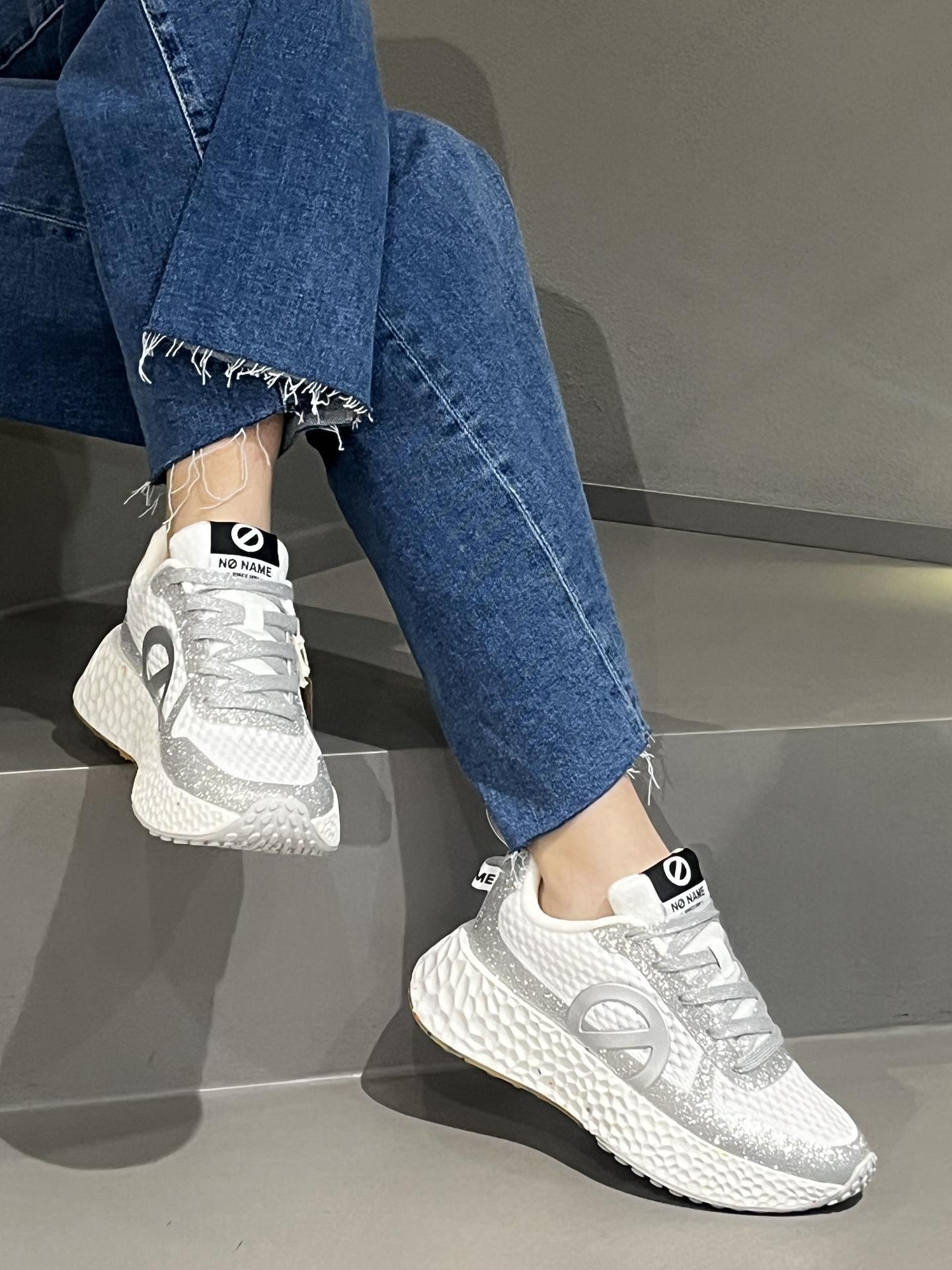SNEAKER STRINGATA IN TESSUTO TECNICO E RIFINITURE GLITTERATE. PLANTARE INTERNO ESTRAIBILE. TACCO 45, FONDO GOMMA.