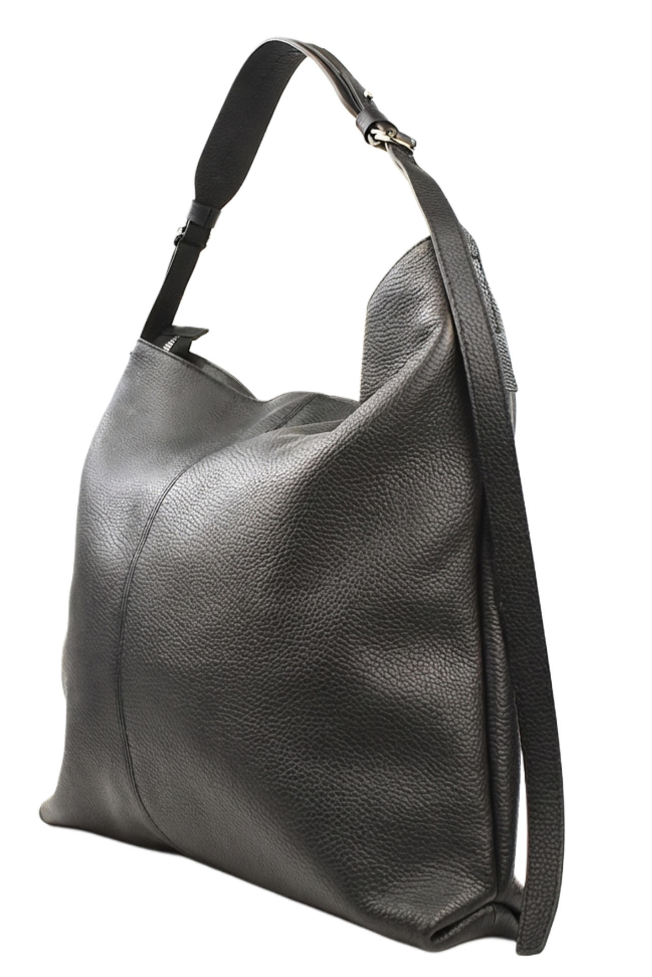 BORSA IN PELLE CON ZIP DI CHIUSURA. INTERNO FODERATO E CON TASCHE. TRACOLLA A SPALLA O ALLUNGABILE MEDIANTE ANELLI DI METALLO AI LATI. MISURE 39X35X8. MADE IN ITALY