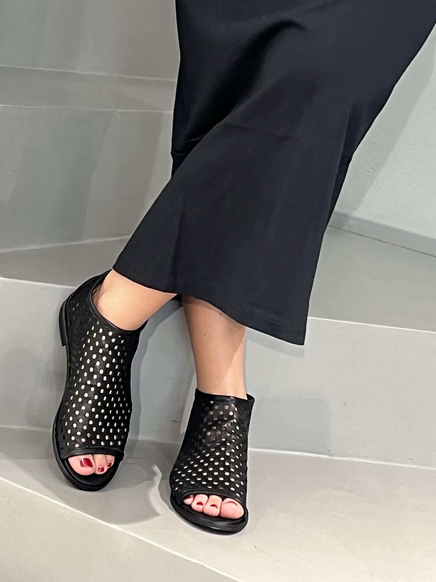 SANDALO IN PELLE TRAFORATA CON ZIP SUL RETRO. MORBIDO SOTTOPIEDE. TACCO 20, FONDO GOMMA. MADE IN ITALY
