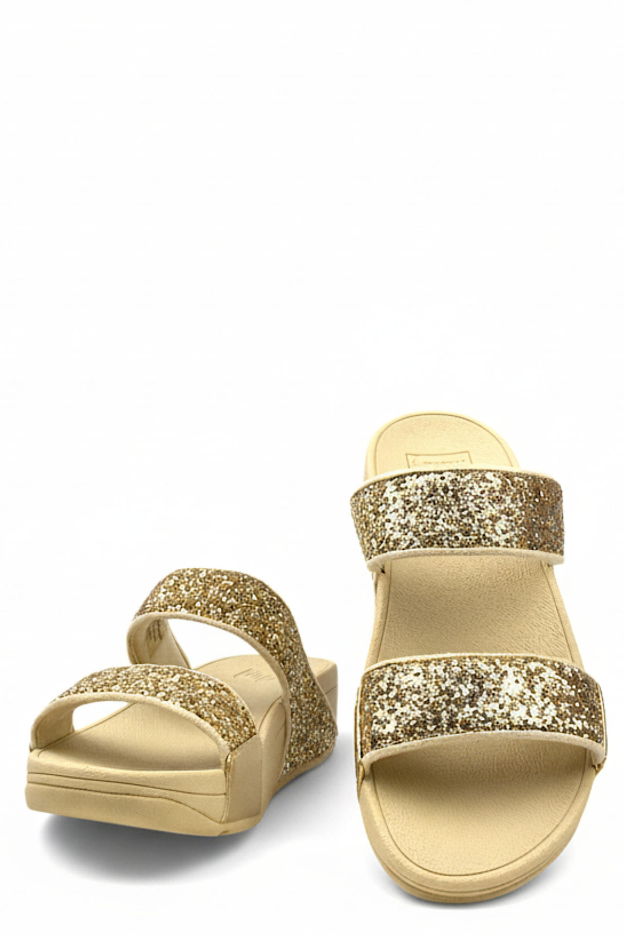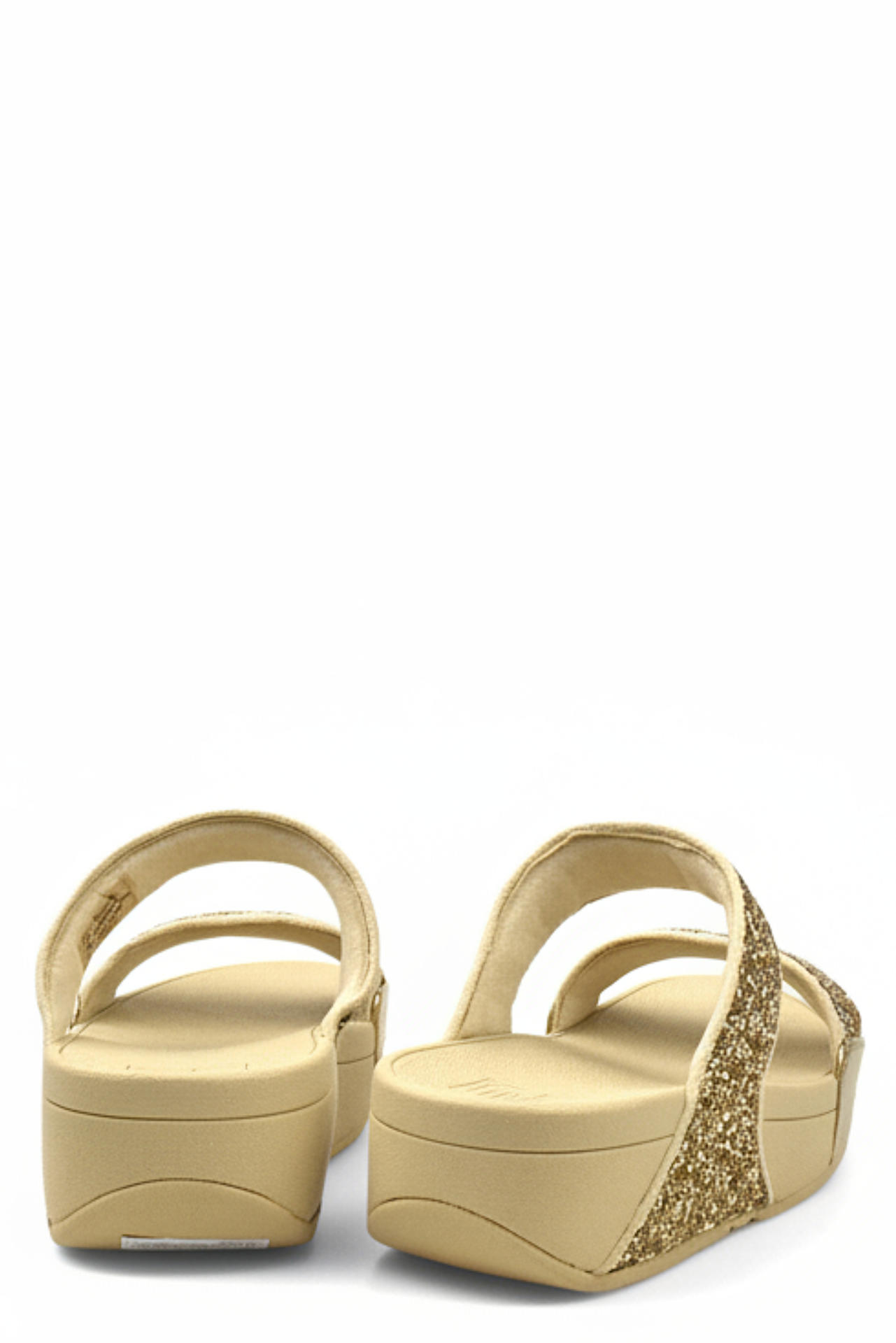 CIABATTA CON MORBIDE FASCE IN MICRO GLITTER. PLANTARE IN GOMMA BREVETTO FIT FLOP CON AMMORTIZZAMENTO E DISTRIBUZIONE DEL PESO CORPOREO SULLA SUOLA PER NON AFFATICARE GLI ARTI. TACCO 40, PLATFORM 20, FONDO GOMMA.